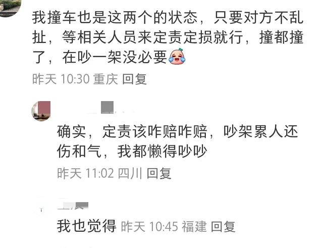 吵也不能解决问题,还不如安安静静的坐着等保险来判定谁主责赔偿就完了,出门在外和气生财。