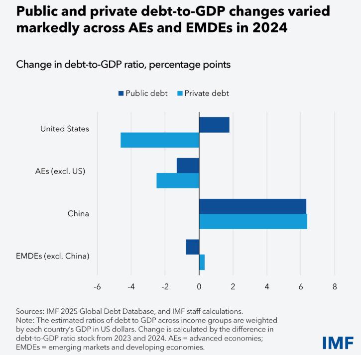 各国的私人债务趋势差异显著。美国私人借贷占GDP的比重大幅下降了4.5个百分点,降至143%,而中国则增长了6个百分点,达到206%。在其他新兴市场和发展中经济体中,巴西、印度和墨西哥等较大经济体的私人借贷激增,而智利、哥伦比亚和泰国的私人借贷则出现下降。
