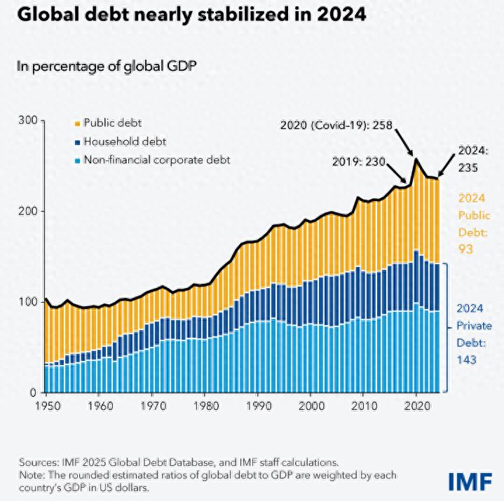 根据国际货币基金组织全球债务数据库的最新更新,去年全球债务总额变化不大,略高于全球国内生产总值(GDP)的235%。