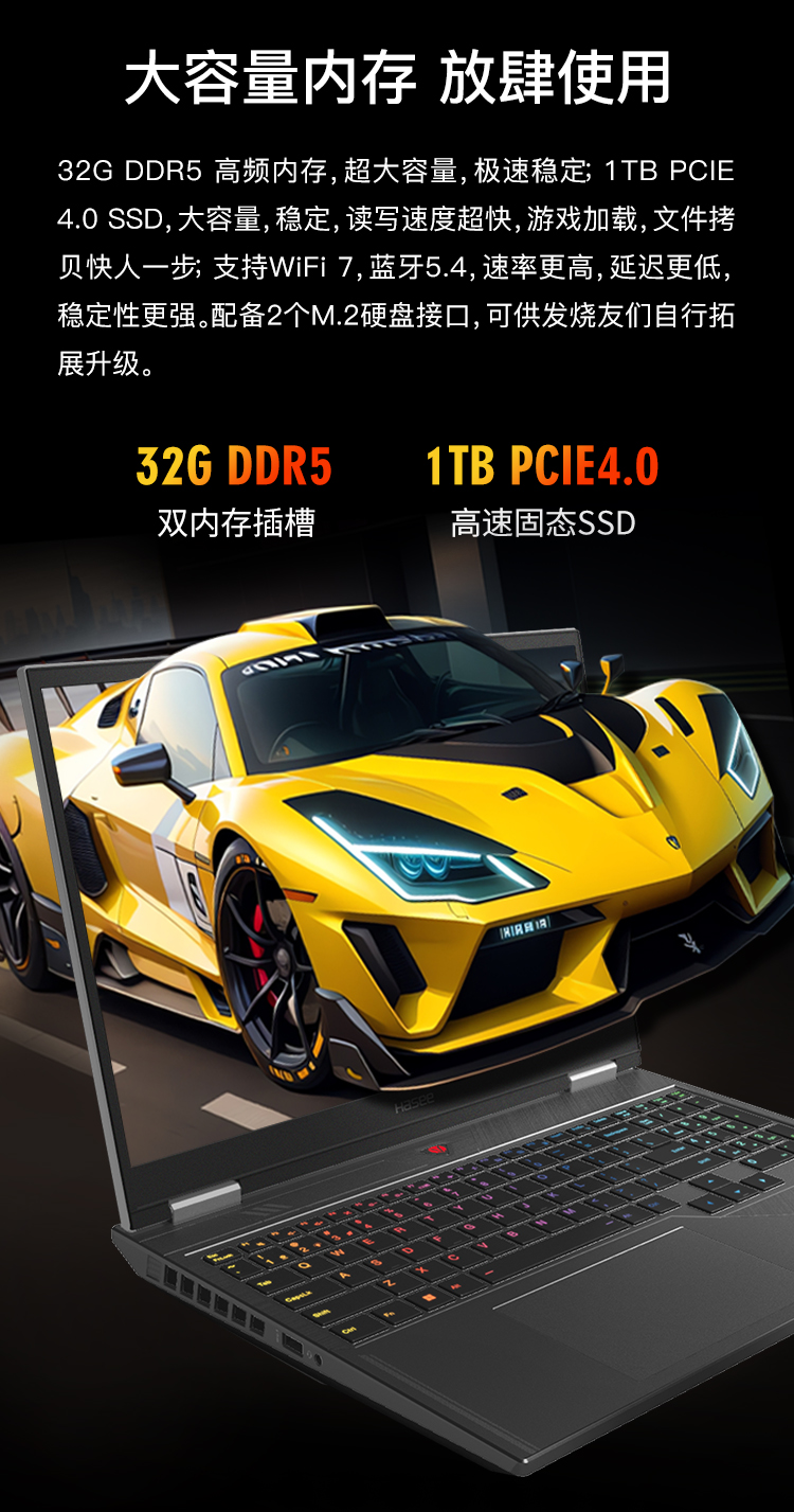 神舟战神T12 Pro还配备了拥有7000跑分的1TB PCIE4.0 SSD,这意味着在存储速度上,它远超传统硬盘,能够提供远远更快的读写速度。特别是现如今的游戏,游戏安装包和存档文件的体积越来越大动辄都是几十或者上百GB,而传统硬盘的读写速度往往成为瓶颈,导致加载时间长,影响游戏体验。神舟战神T12 Pro搭载的7000跑分1TB PCIE4.0 SSD,通过超快的读取速度,能让玩家在启动游戏和加载地图时,几乎不再感受到延迟。这种极速的存储体验,确保了游戏可以迅速进入状态,极大地提升了用户的使用体验。