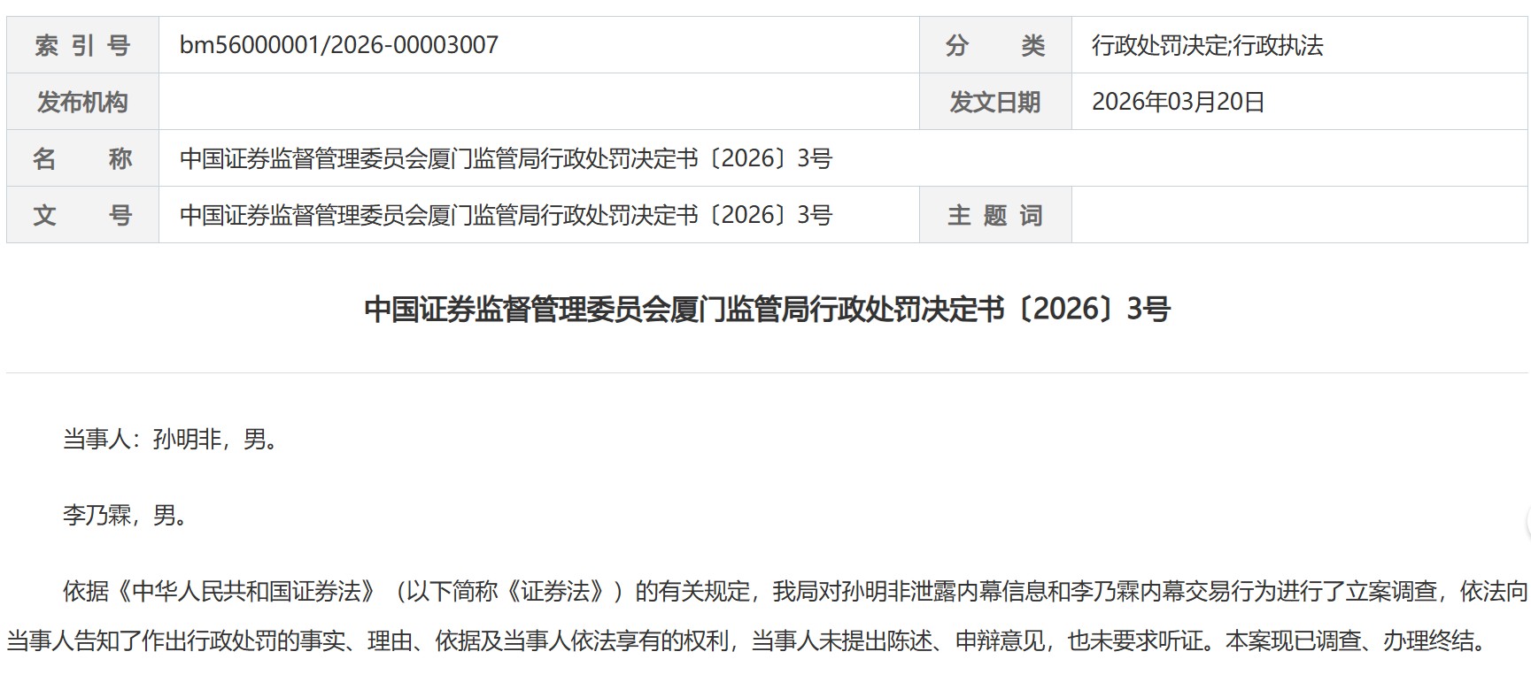 针对两人的违法行为,厦门证监局认定,孙明非的行为违反《证券法》相关规定,构成泄露内幕信息类内幕交易行为;李乃霖的行为构成非法获取内幕信息并进行交易的内幕交易行为。最终,厦门证监局决定对孙明非处以135万元罚款,对李乃霖没收违法所得80.02万元、并处216.06万元罚款,李乃霖合计罚没296.08万元。
