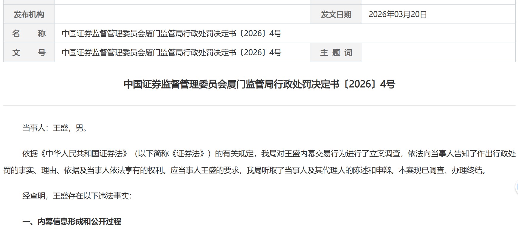 在〔2026〕4号处罚决定书中,当事人王盛因单独实施内幕交易被重罚。经查,王盛与相关内幕信息知情人相识,在内幕信息敏感期内,双方存在联络接触。2024年8月12日至10月10日期间,王盛累计买入相关上市公司股票154.36万股,买入金额达251.52万元,最终交易盈利349.57万元。