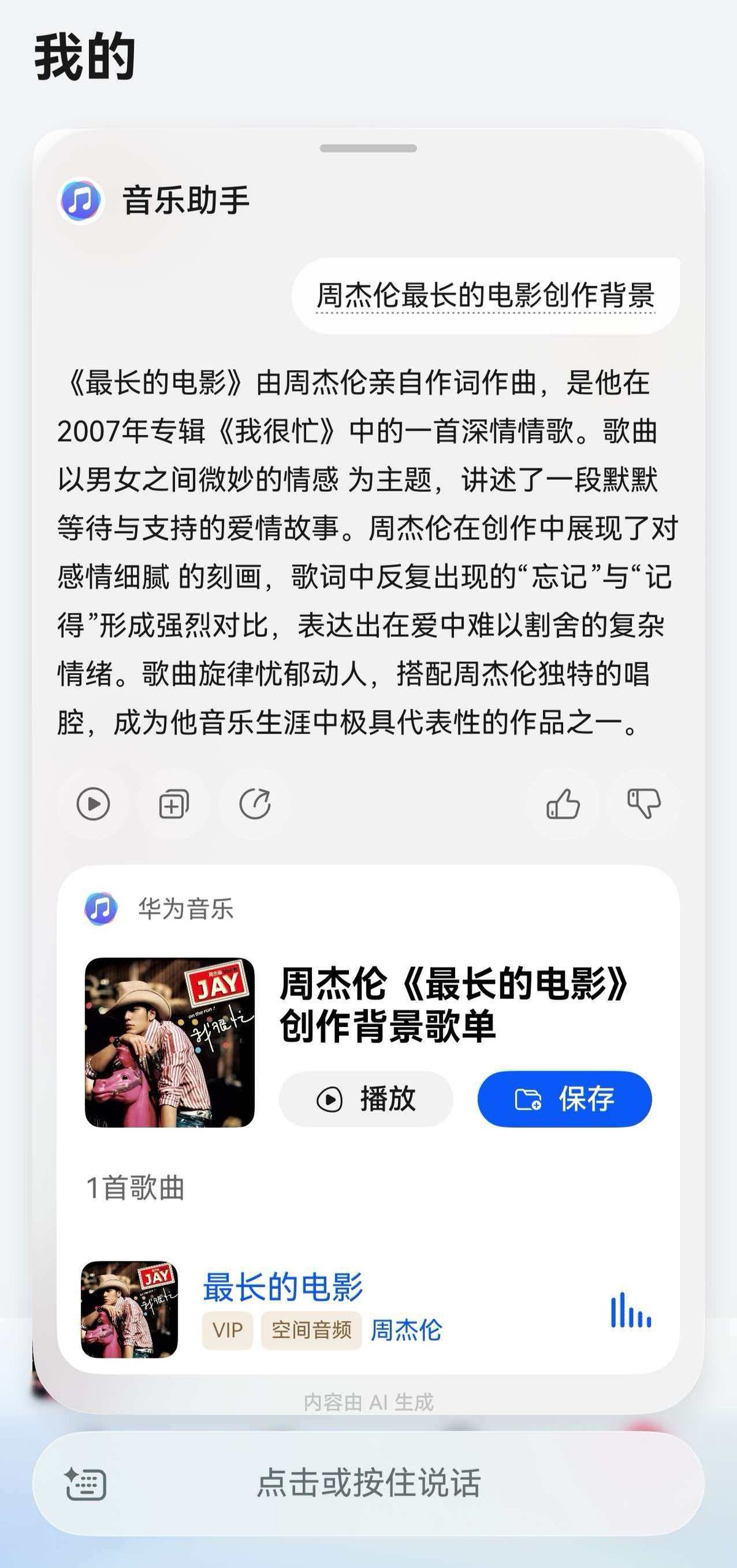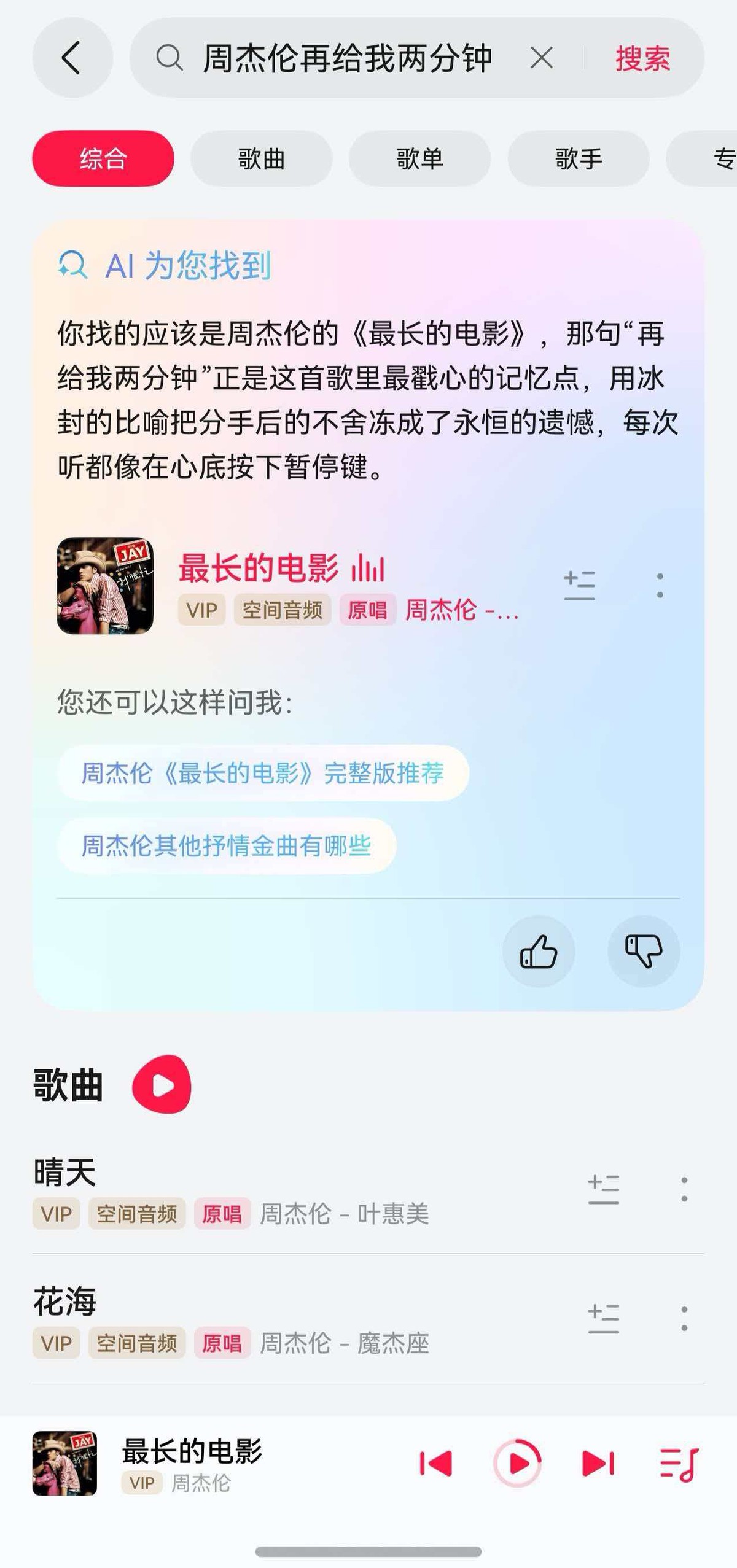 当然我想了解歌曲背后的故事,也可以问音乐助手,比如:周杰伦《最长的电影》创作背景?音乐助手立马给我总结好了,边听边问,不用来回切换App。