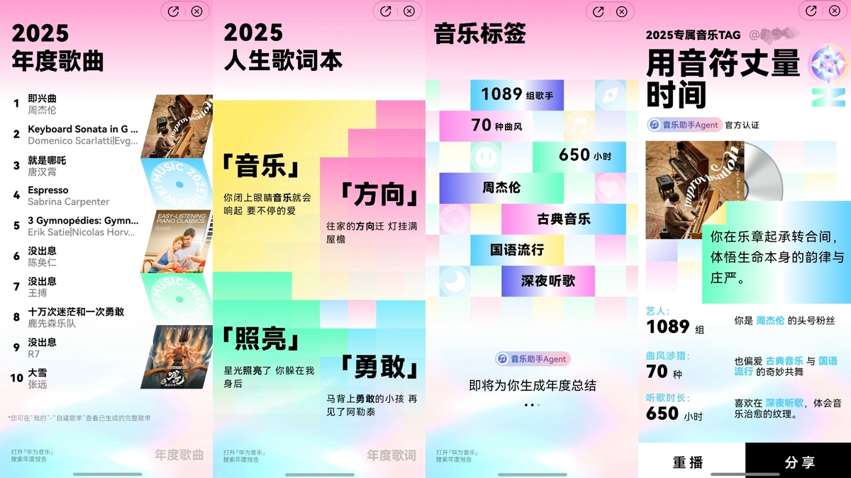 你们都看华为音乐的年度听歌报告了吗?我刚看完我的,不得不说,这份报告很准确地概括了我这一年的听歌经历,不管是年度歌手还是年度歌曲,都跟我心里想的一模一样。作为资深杰迷,2025 这一整年我几乎把《即兴曲》盘包浆。