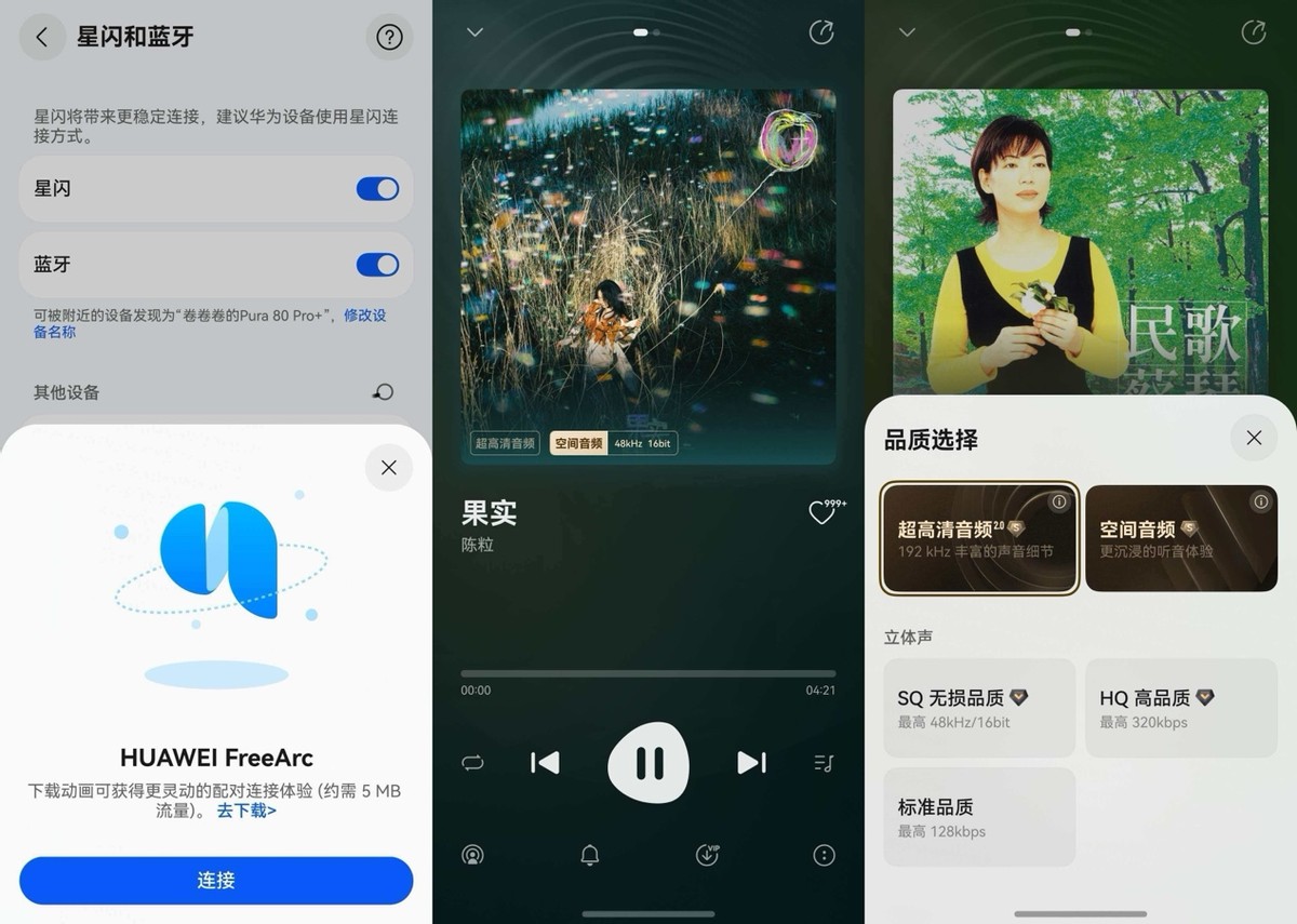音质方面就更不用说了,自从我入手了华为FreeArc,听歌时听感直接拉满:尤其是开启空间音频后,播放陈粒的《果实》,她独特的嗓音好像就在我的耳边打转。如果用的是手机外放,我往往会选择“超高清音频”,《渡口》的鼓点、梆子声都清楚得不得了。