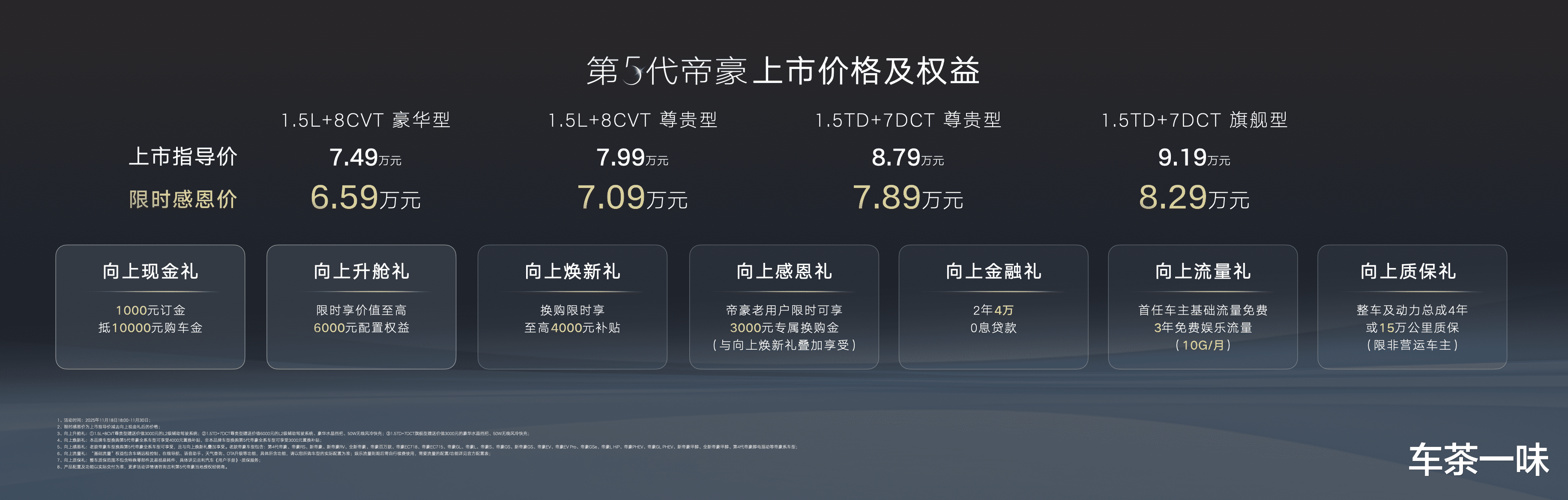 感恩400万,荣耀新篇章。第5代帝豪即日起推出7重上市礼遇,2025年11月30日前购车用户,可享包含1000元订金抵10000元购车金的向上现金礼;限时享价值至高6000元配置权益的向上升舱礼;换购限时享至高4000元补贴的向上焕新礼;帝豪老用户可享3000元专属换购金的向上感恩礼(与向上焕新礼叠加享受);2年4万0息贷款的向上金融礼;首任车主基础流量免费,3年免费娱乐流量(10G/月)的向上流量礼;整车及动力总成4年或15万公里质保(限非营运车主)的向上质保礼。除此之外,作为帝豪持续越级向上,给用户带来超越期待体验精神的延续,用户还可选装千里浩瀚辅助驾驶H3方案。第5代帝豪首次将包含行车、泊车、安全三大维度的高阶辅助驾驶系统带入8万级燃油车型,拥有最高支持120km/h刹停的AEB急刹避险功能和同级唯一AES主动紧急避让功能,为用户提供“沃尔沃”式安全感,真正做到“科技平权、油电同智”。