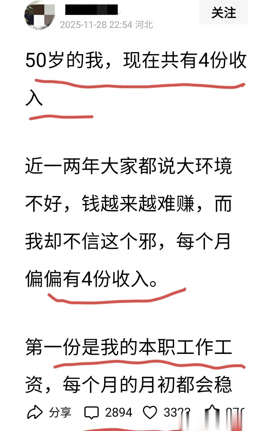 看到这篇微头条的时候,很多人第一反应是热血沸腾,忍不住就去评论:“我也有!”“我也想这样!”可你有没有停下来问过自己:你说的“我也有”,和她写的“4份收入”,真的是一回事吗?