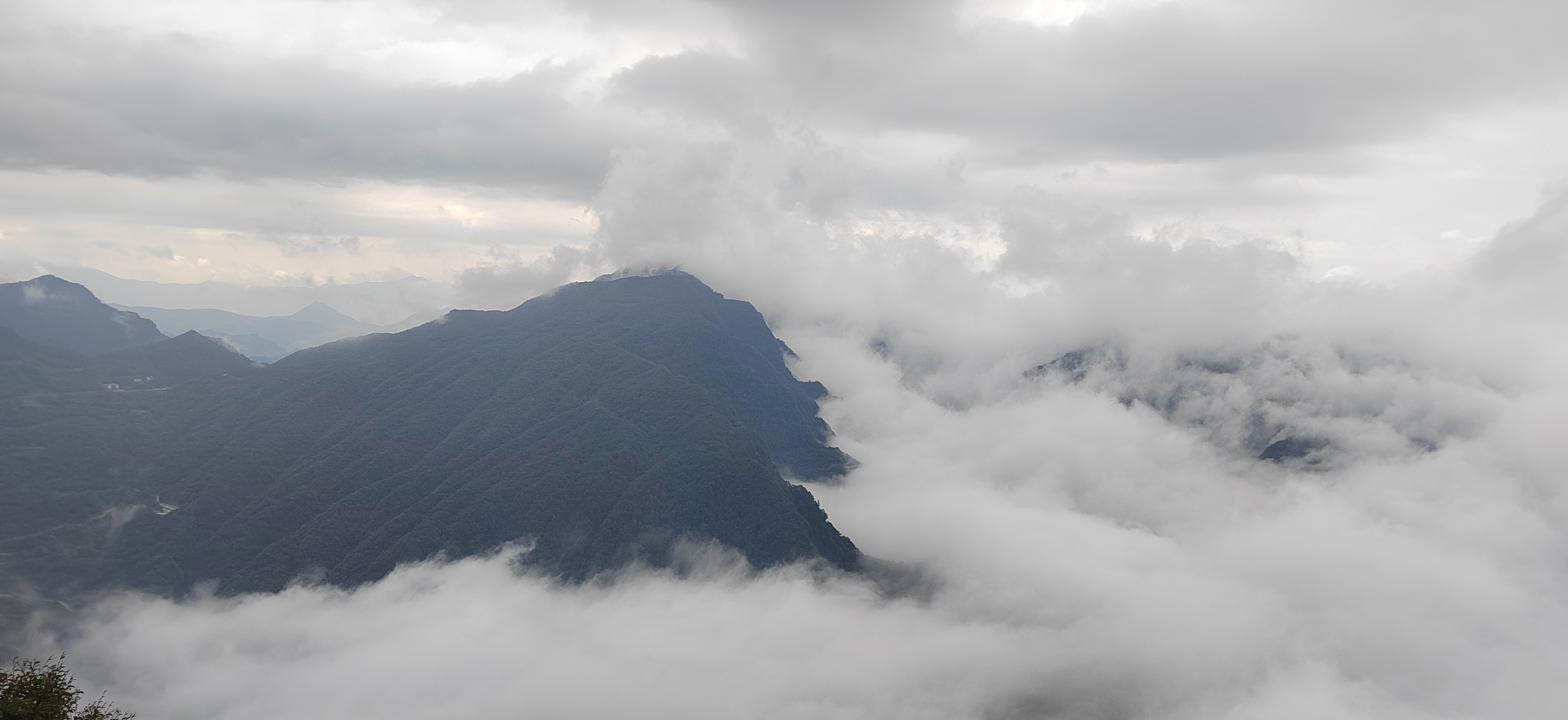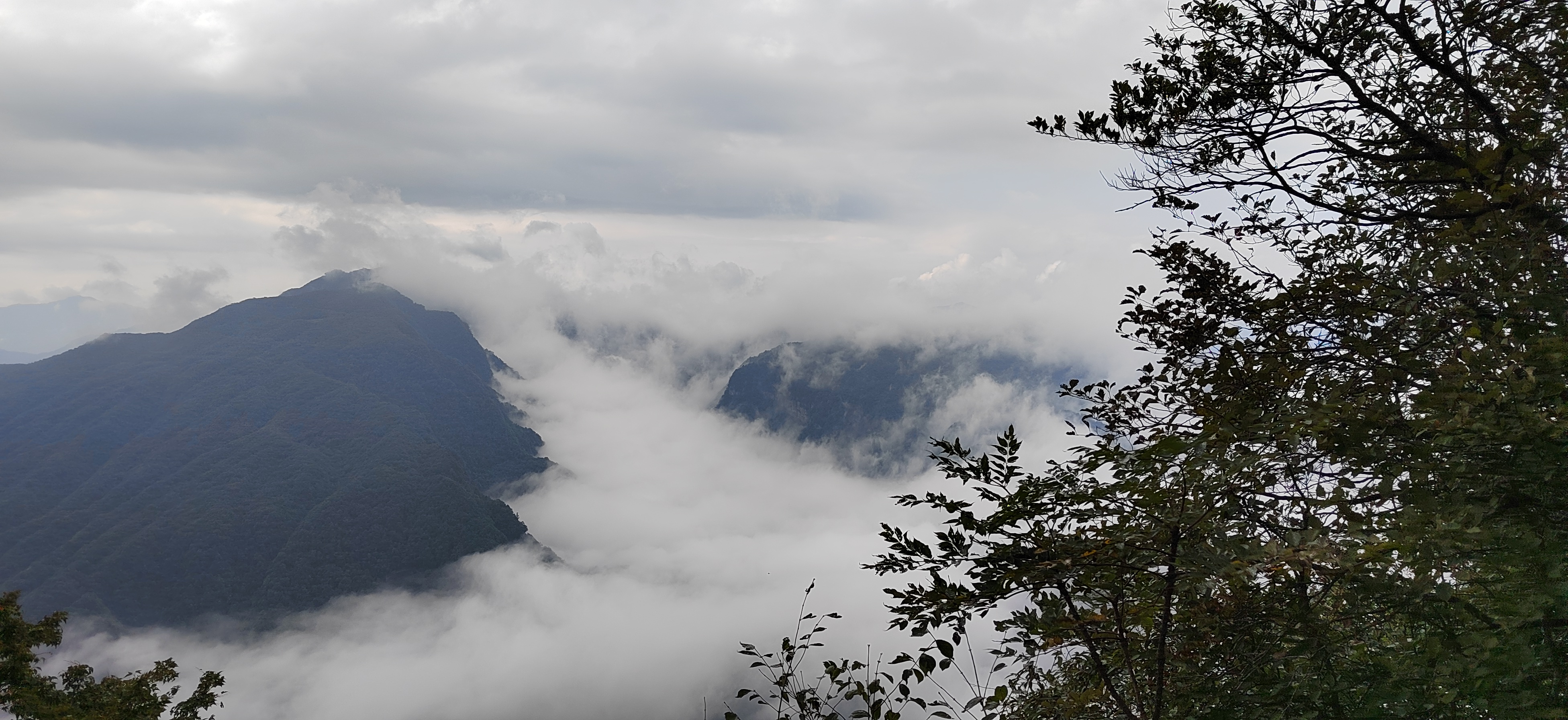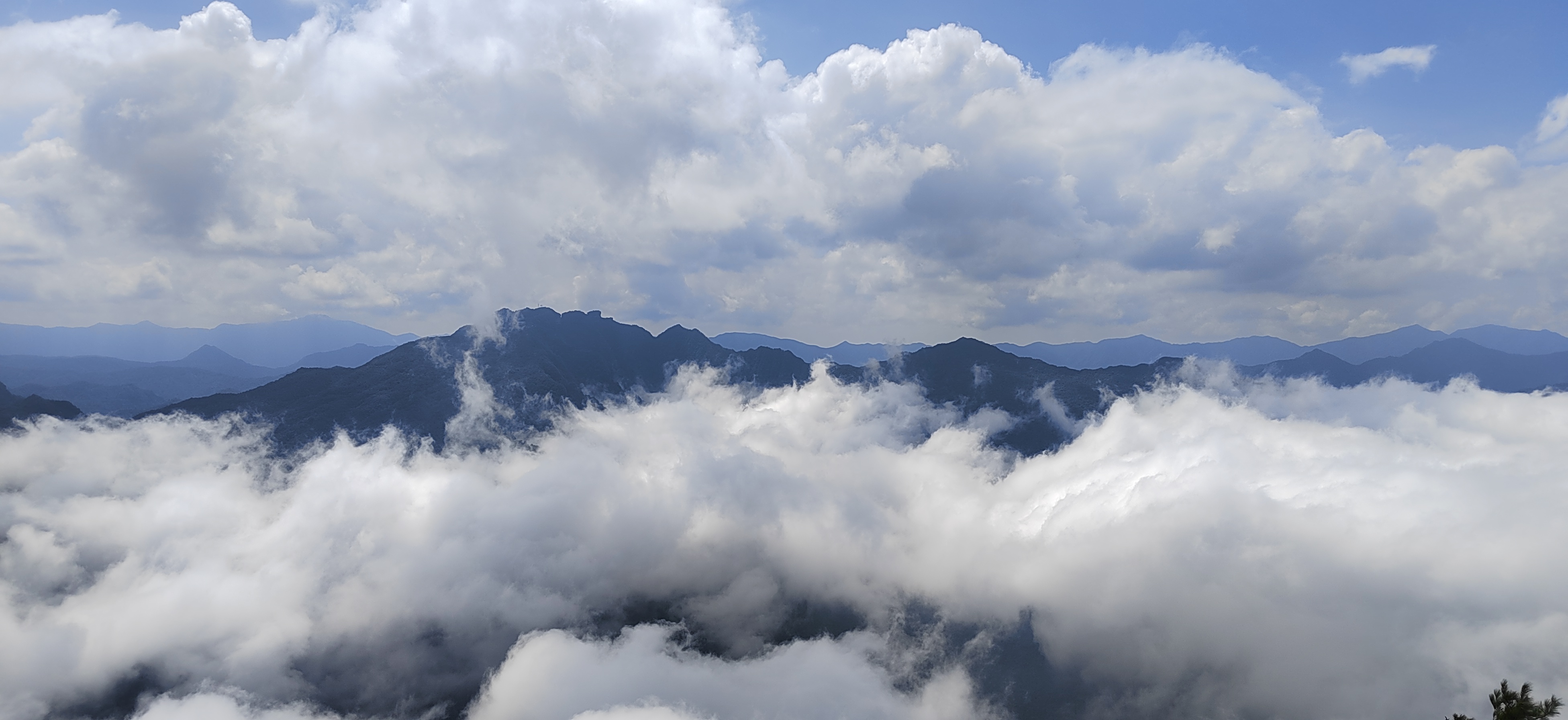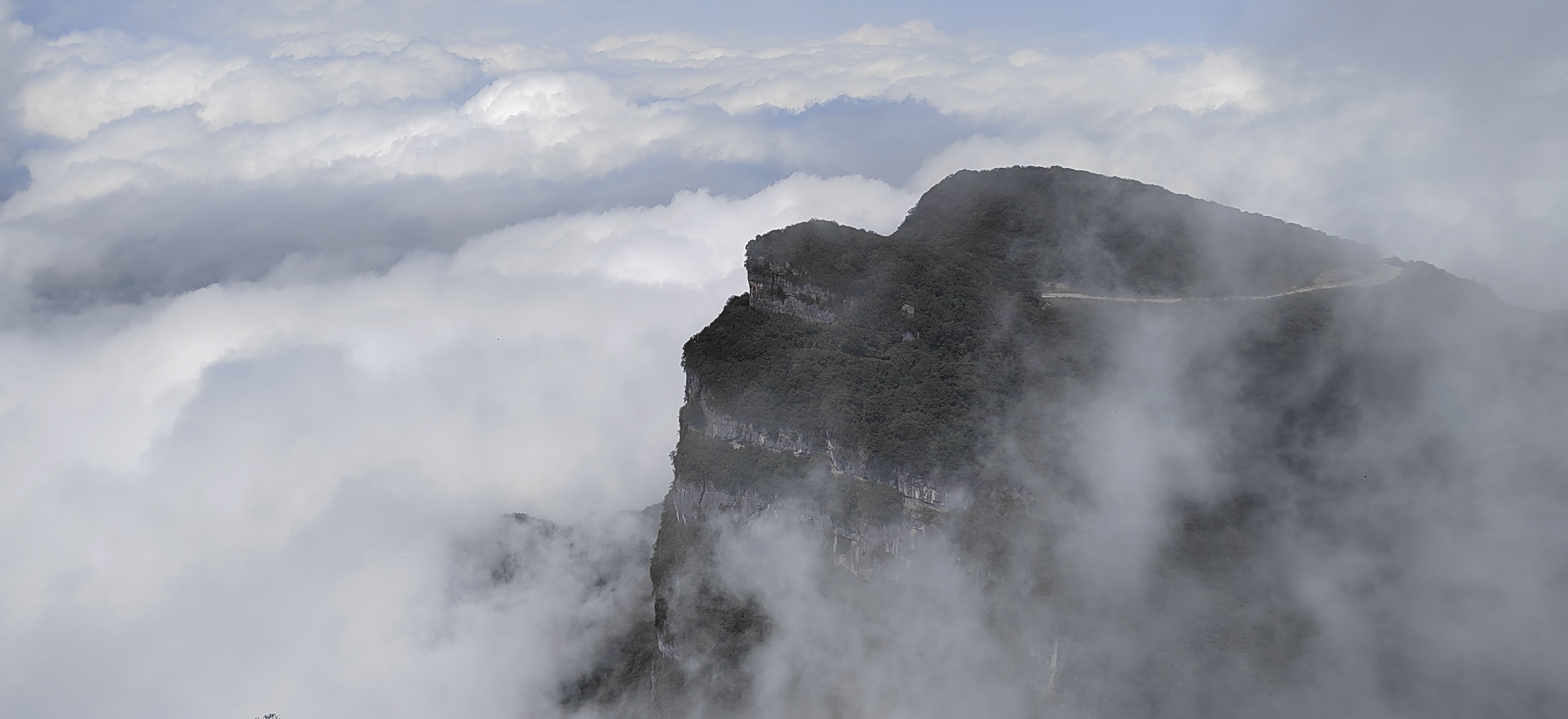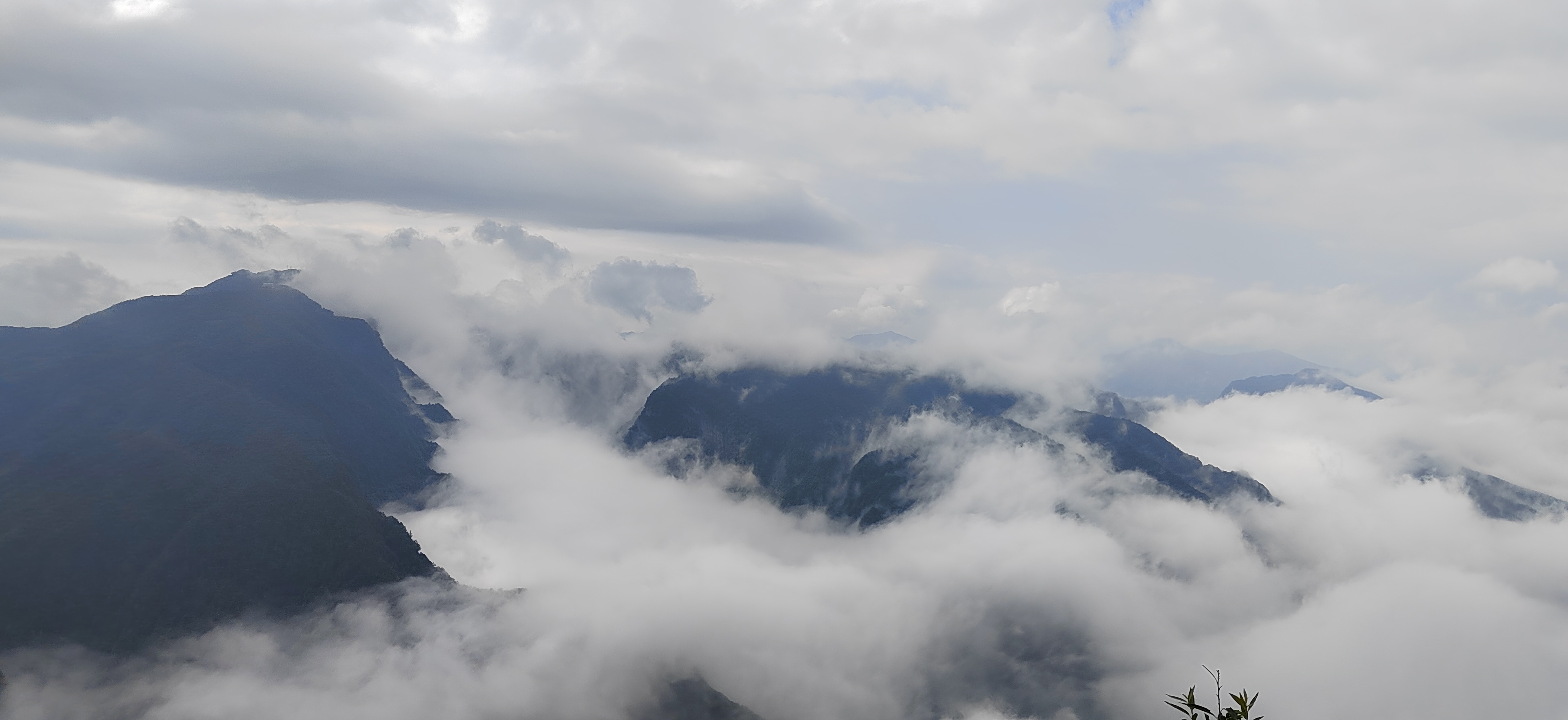 驻足观景台远眺,斑斓秋林与洁白云海相拥,红叶在云隙间忽明忽暗。待云雾稍散,远处峰峦轮廓渐显,与脚下流动的云涛相映,分不清是山在云中,还是云在山间。此景无言,唯觉尘心尽洗,只剩天地辽阔与云海温柔。