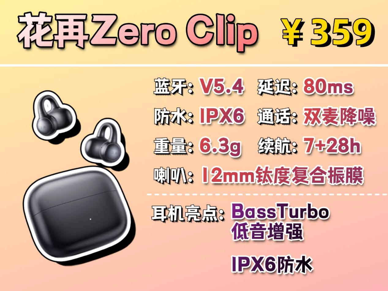 花再Zero Clip采用C形桥与12度黄金夹角设计,单耳6.3克在佩戴时能牢固贴合耳廓,运动时不易滑落。