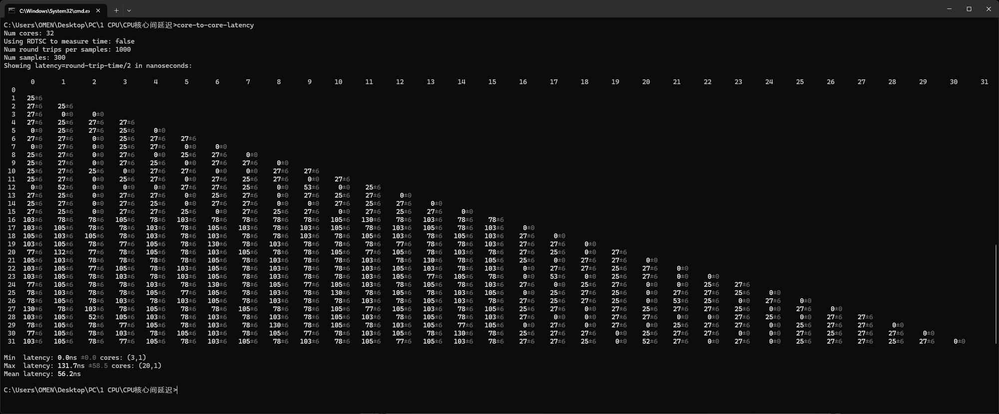 除了性能测试之外,由于锐龙9 8945HX采用的是双CCD设计,所以核心延迟需要测试一下。从测试结果来看,核心延迟的平均值为56.2ns,表现还可以。不过由于双CCD设计,跨CCD的延迟明显很高,最高达到了131.7ns,还是比较明显的。