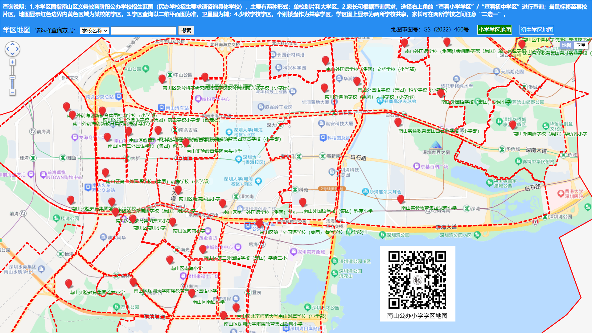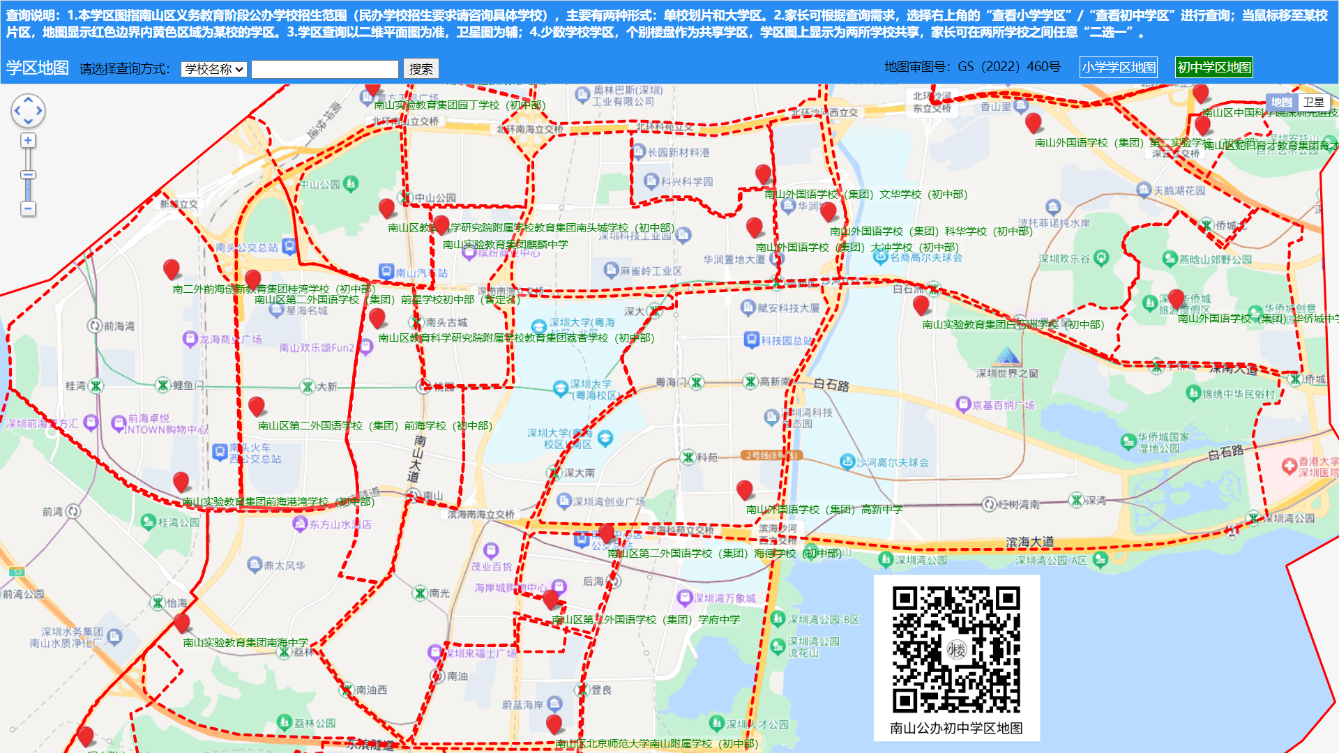 以上为南山区教育局官方发布的学区电子地图,通过电子地图查看到每个居住地段对应的中小学校,小楼在上图中添加了链接二维码,大家可以通过扫描二维码进入官网查看细化的对应信息。
