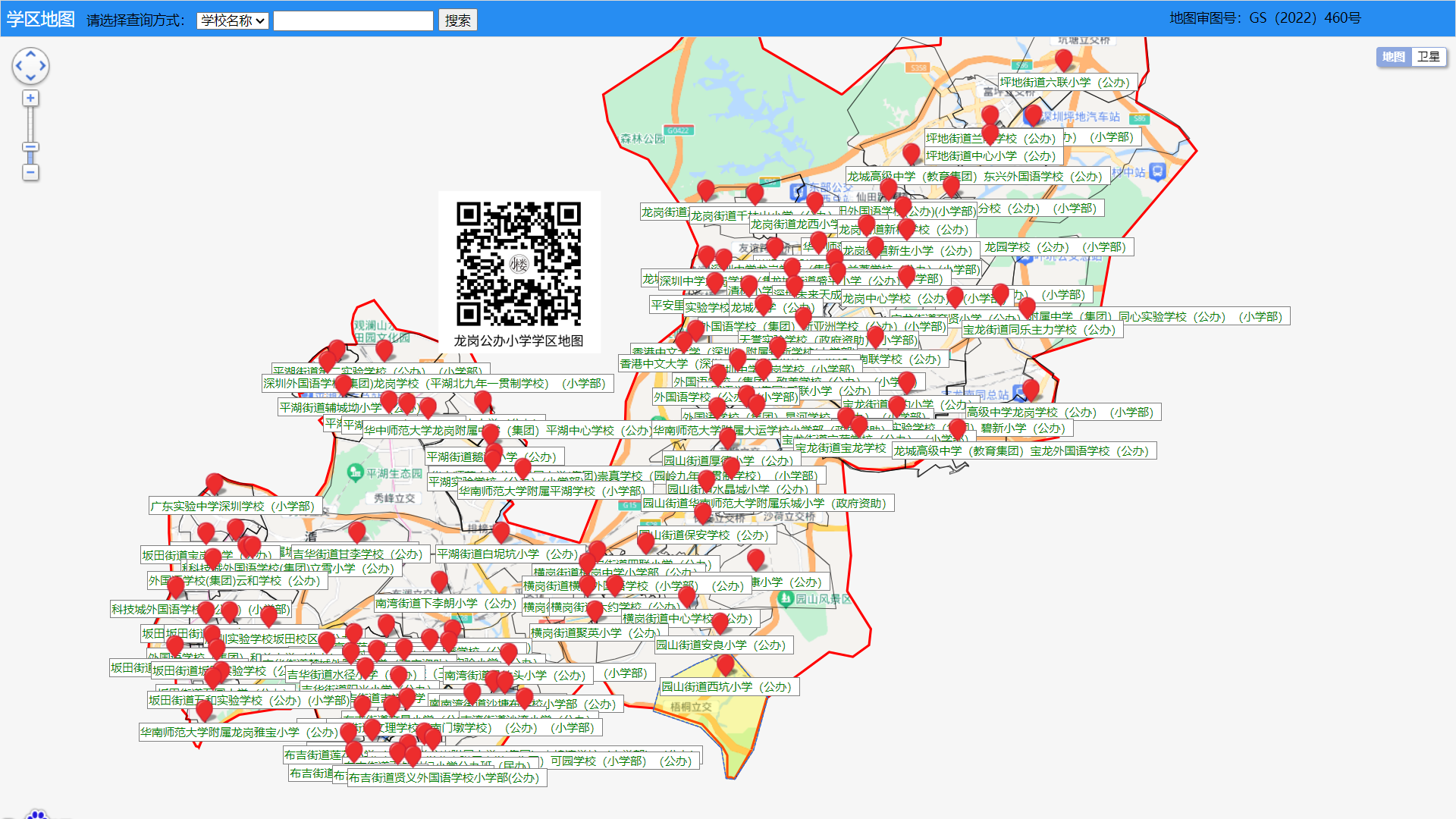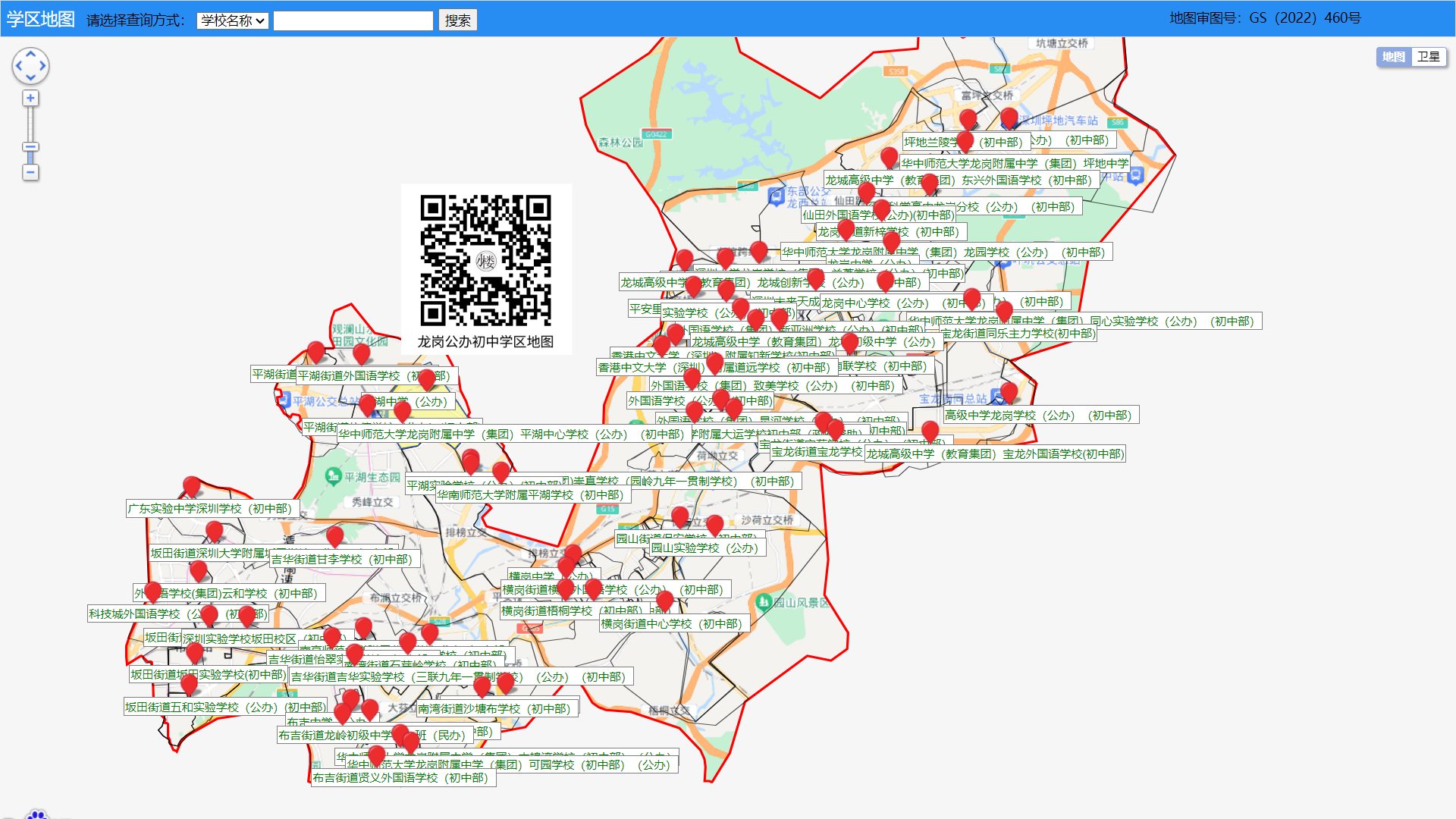 以上为龙岗区教育局官方发布的学区电子地图,通过电子地图查看到每个居住地段对应的中小学校,小楼在上图中添加了链接二维码,大家可以通过扫描二维码进入查看细化的对应信息。