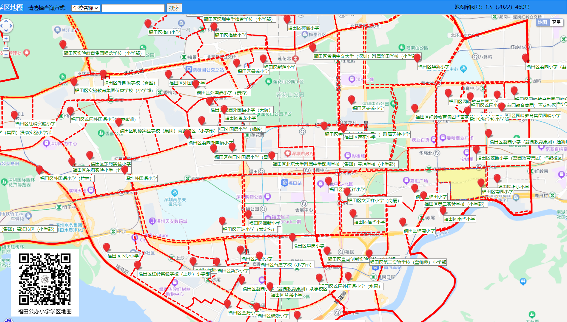 以上为福田区教育局官方发布的学区电子地图,通过电子地图查看到每个居住地段对应的中小学校信息。小楼在上图中添加了链接二维码,大家可以通过扫描二维码进入官网查看细化的信息。