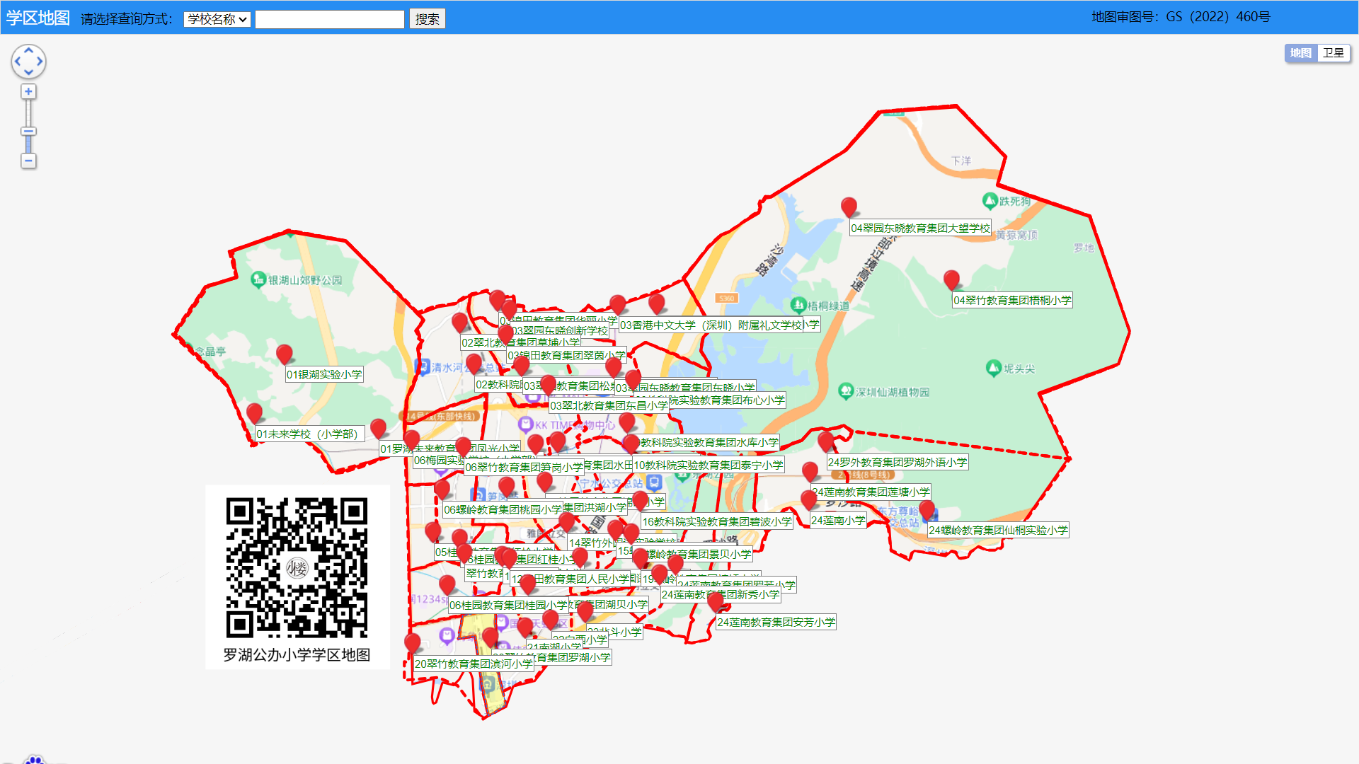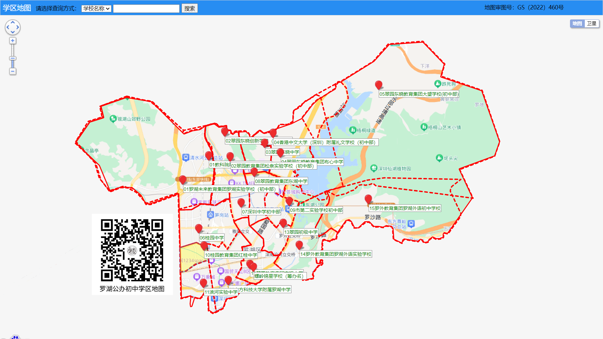 以上为罗湖区教育局官方发布的学区电子地图,通过电子地图查看到每个居住地段对应的中小学校,小楼在上图中添加了链接二维码,大家可以通过扫描二维码进入官网查看细化的对应信息。