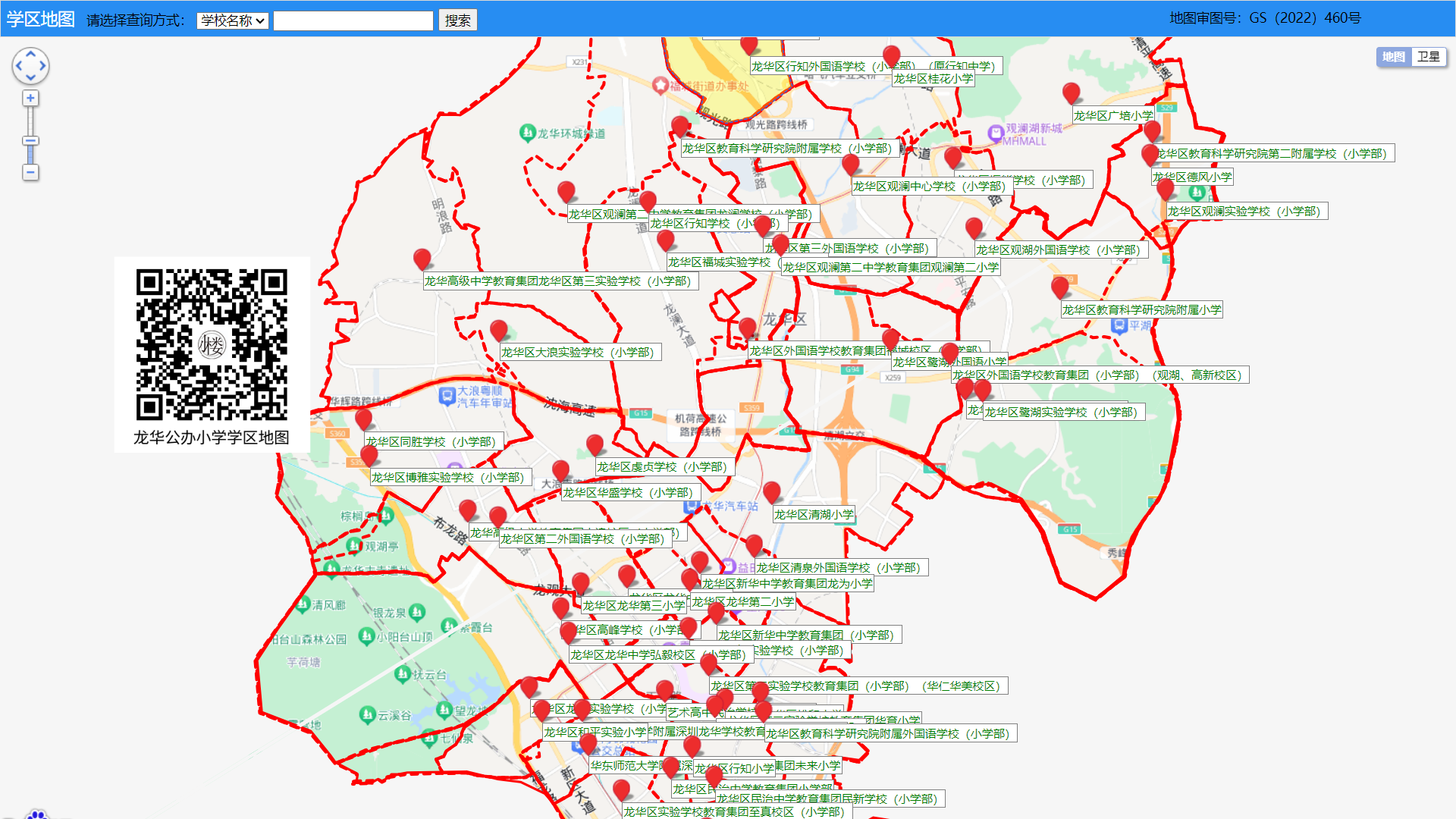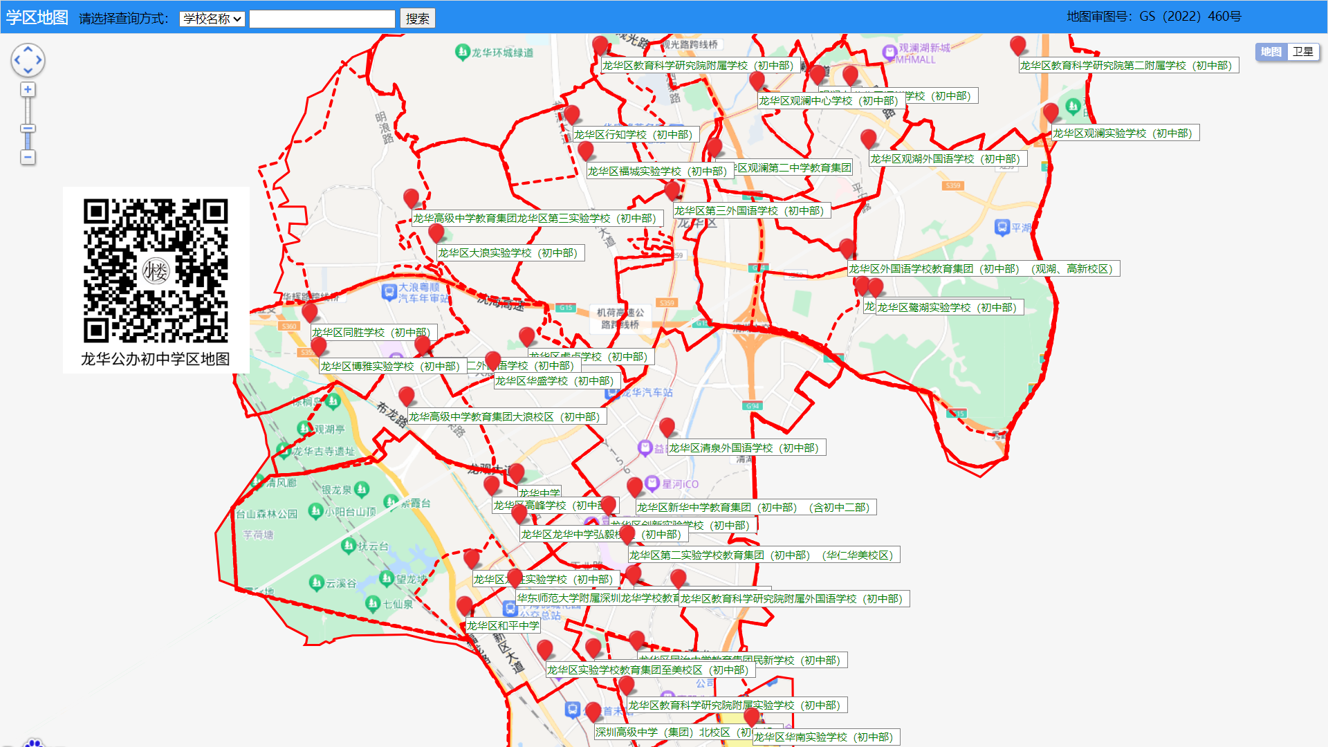 以上为龙华区教育局官方发布的学区电子地图,通过电子地图查看到每个居住地段对应的中小学校,小楼在上图中添加了链接二维码,大家可以通过扫描二维码进入官网查看细化的对应信息。