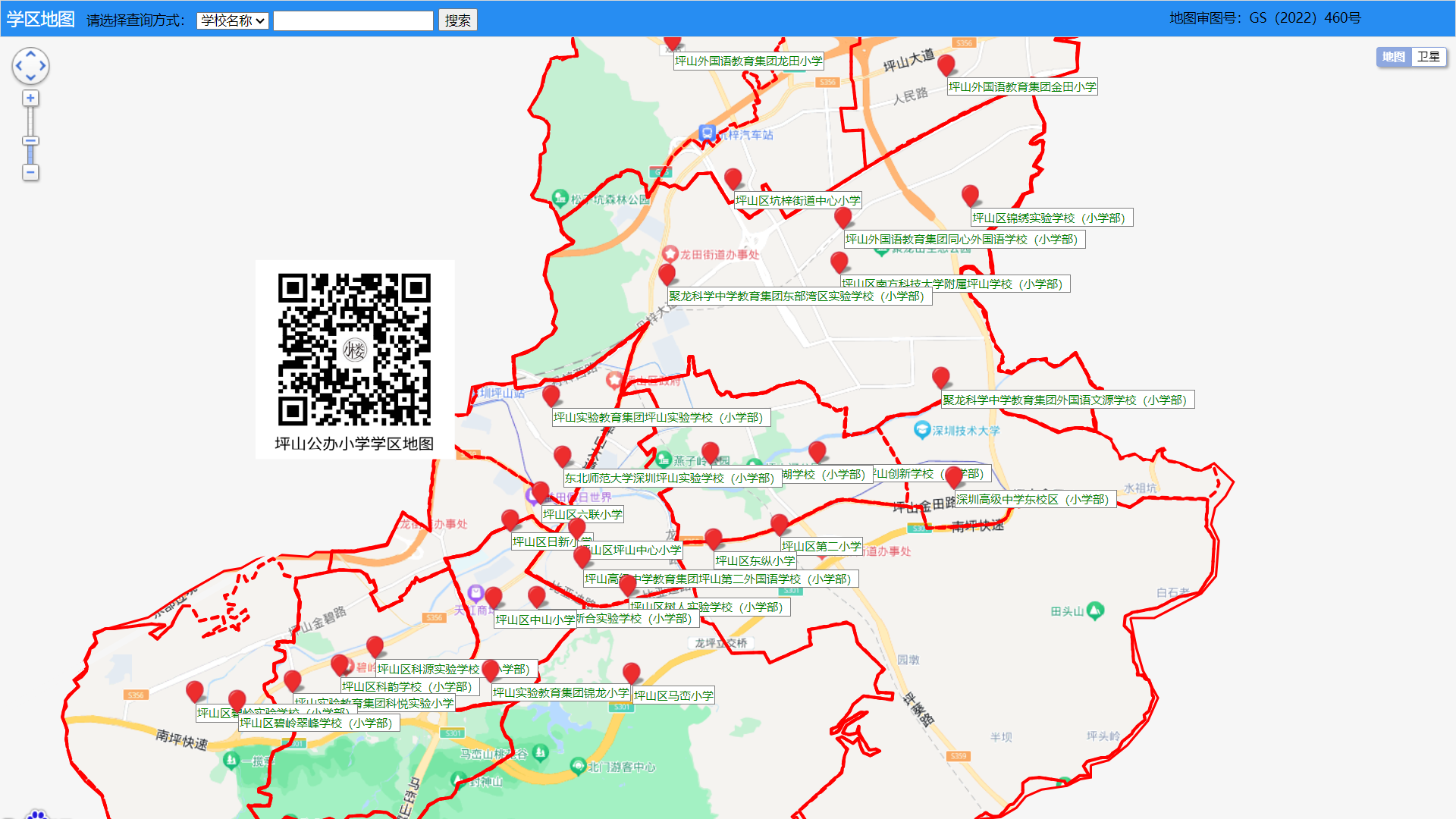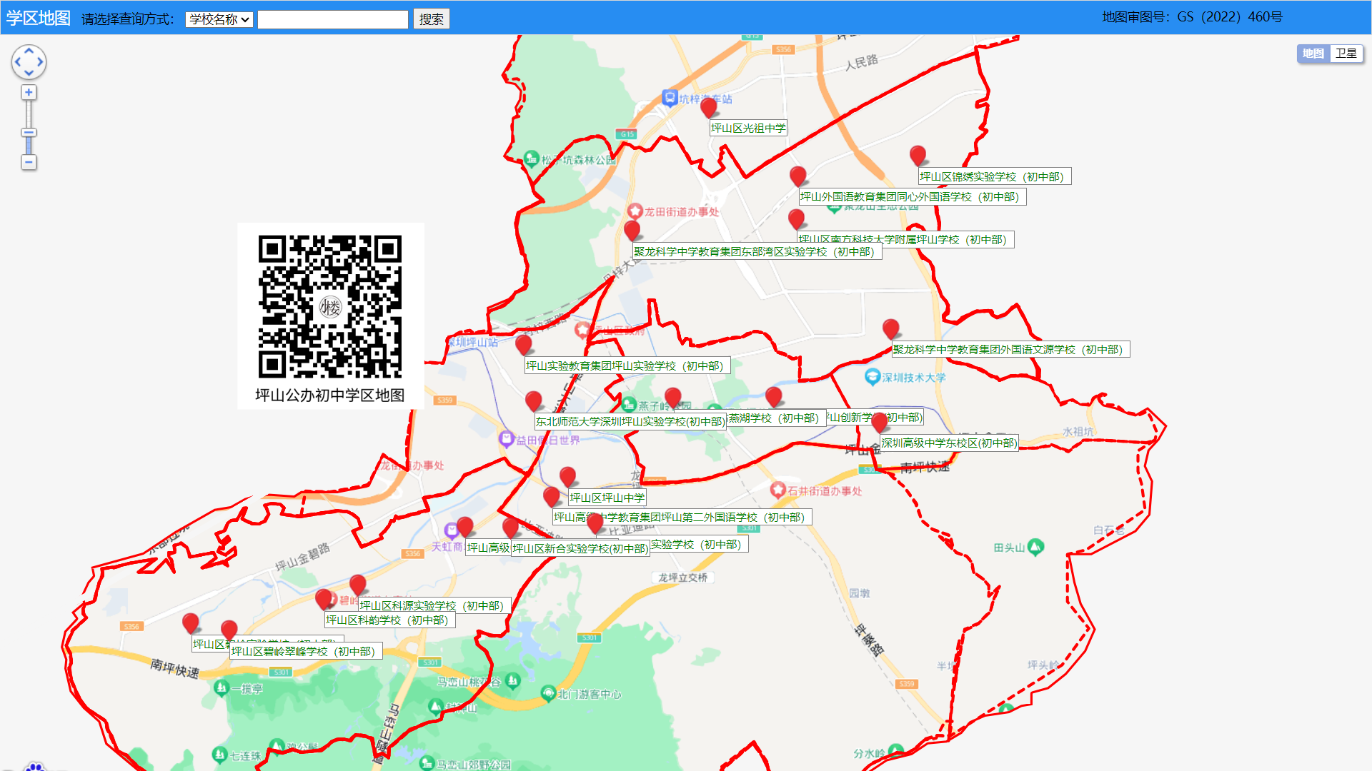 以上为坪山区教育局官方发布的学区电子地图,通过电子地图查看到每个居住地段对应的中小学校,小楼在上图中添加了链接二维码,大家可以通过扫描二维码进入官网查看细化的对应信息。