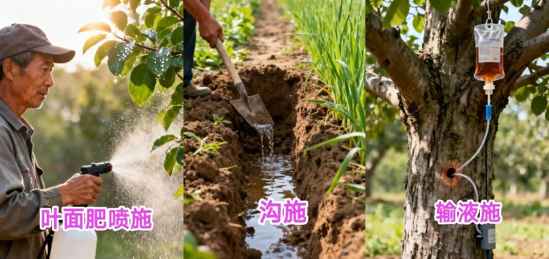 在作物根系附近,开沟或挖穴。一般一年生长的作物10公分,多年生长的25公分左右。一般2%的硫酸亚铁溶液,一年生的作物每棵施入0.5-1升,多年生长作物5升左右。