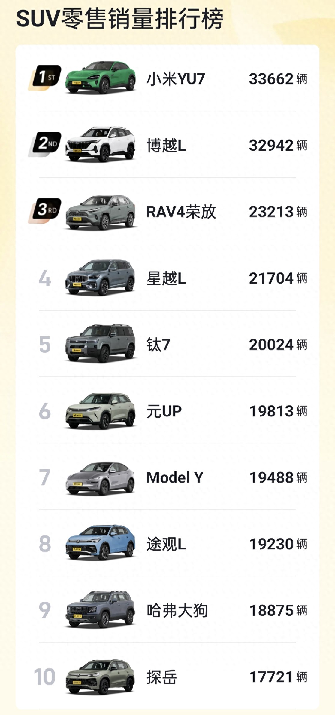 2025年10月,国内SUV市场延续高热态势,整体竞争激烈。数据显示,本月SUV销量前十车型中,自主品牌表现亮眼,占据了榜单的绝大多数席位,新能源与传统燃油车型形成双线竞争格局。其中,小米YU7以超3.3万辆的成绩强势登顶,博越L紧随其后,传统热门车型RAV4荣放依旧稳居前列。整体来看,10月SUV销量前十车型销量区间在 1.7万至3.3万辆 之间,自主品牌的产品力和市场影响力持续提升。
