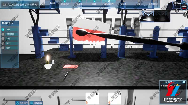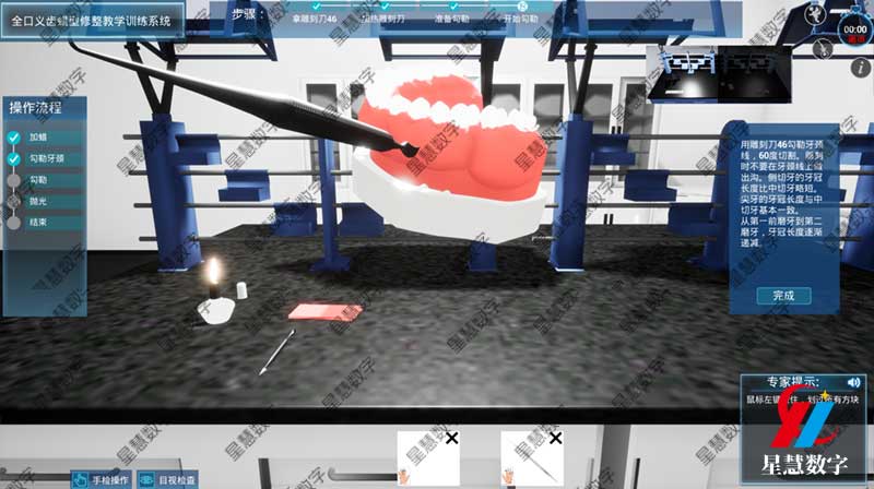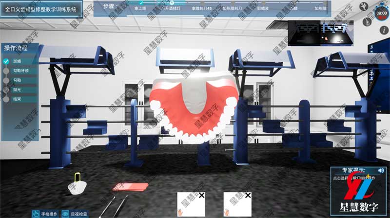 星慧数字基于口腔数字化虚拟仿真平台开发的“全口义齿蜡型修整教学训练系统”应运而生。该平台利用计算机图形学和高精度力反馈技术,构建了一个逼真的虚拟临床环境。作为平台中的功能模块之一,全口义齿蜡型修整系统专注于解决牙医学教育中“看不见、摸不着、进不去”的问题。