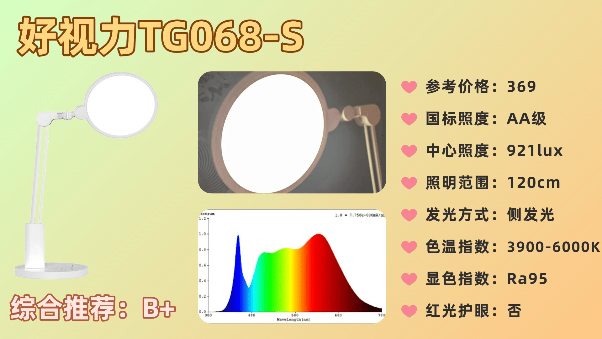 好视力TG068-S护眼台灯经过三重技术处理后的光线较为柔和,不易刺眼,但未采用全光谱技术,光线舒适度相对一般。光源面使用的灯珠均为RG0级别,有效降低蓝光对眼睛的伤害。配备30秒延迟自动关灯功能,夜间使用更安全。支持三档色温切换,但触控按键反应速度较慢,操作体验一般。有一个25分钟提醒休息功能,但不能调整时间,25分钟稍微有点短。