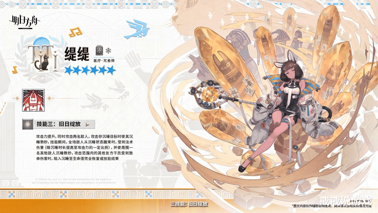先来看天赋,天赋一是自身可以攻击沉睡的敌人,且攻击非移动敌人时对其额外造成相当于攻击力一定比例的法术伤害,在场时沉睡中的敌人每秒受到缇缇攻击力一定比例的法术伤害。一天赋没啥看点,二天赋就牛了,场上的【米诺斯】或【萨尔贵】千员生命值高于一定比例时,获得提升一定攻速的精力充沛。这是双阵营选手啊,能睡敌人练功,又能奶又能打,我说抽了等卫戍协议常驻战个未来、我说抽了等卫戍协议常驻战个未!