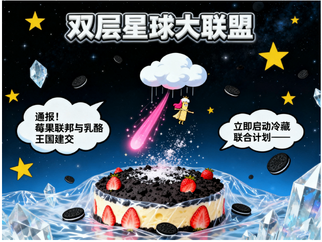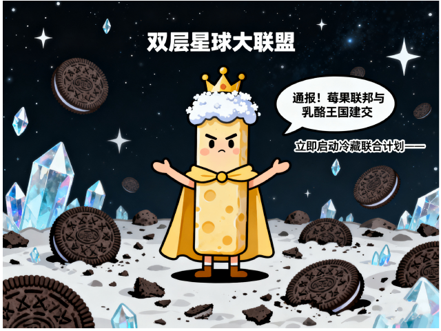 顶着糖霜雪帽的乳酪条小总统,在奥利奥碎陨石带发表就职演说:“通报!莓果联邦与乳酪王国建交”,“立即启动冷藏联合计划——”