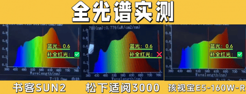 而松下则是一款紫光激发的全光谱,实际光谱连续性不错,也能够呈现较为舒适的光线,而孩视宝E5-160W-R,虽然也补全了红光,但光谱分布并不均衡,实际光线会比较一般。