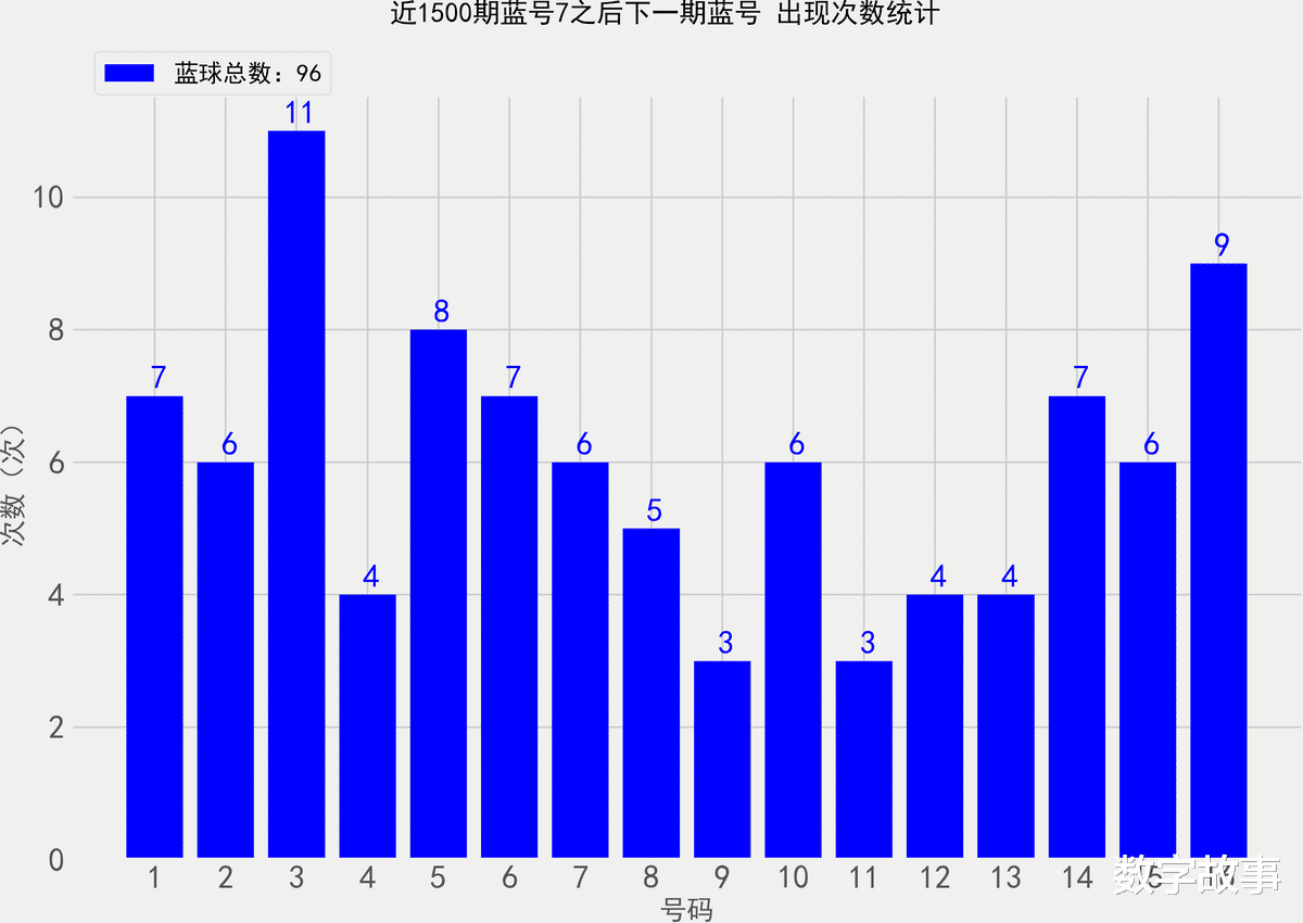 统计近1500期蓝号7之后, 各蓝球的出现次数双色球26034期蓝号是7找出近1500期蓝球7号之后, 下一期出现的所有蓝号,统计其出现次数。,除开这一期,总共出现了96次7号球那么统计的样本数据是96个