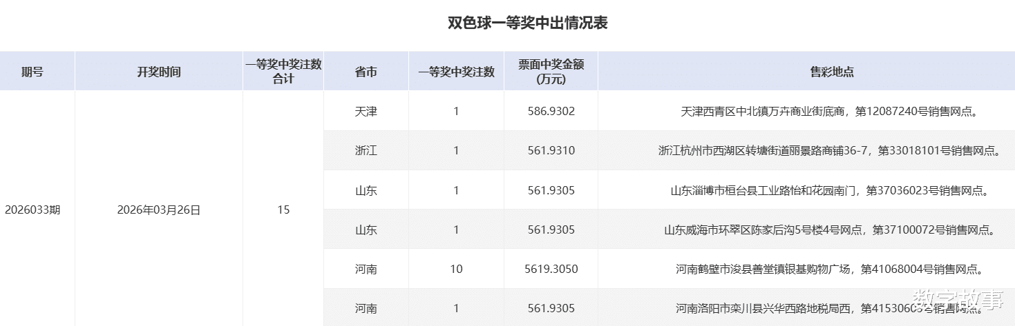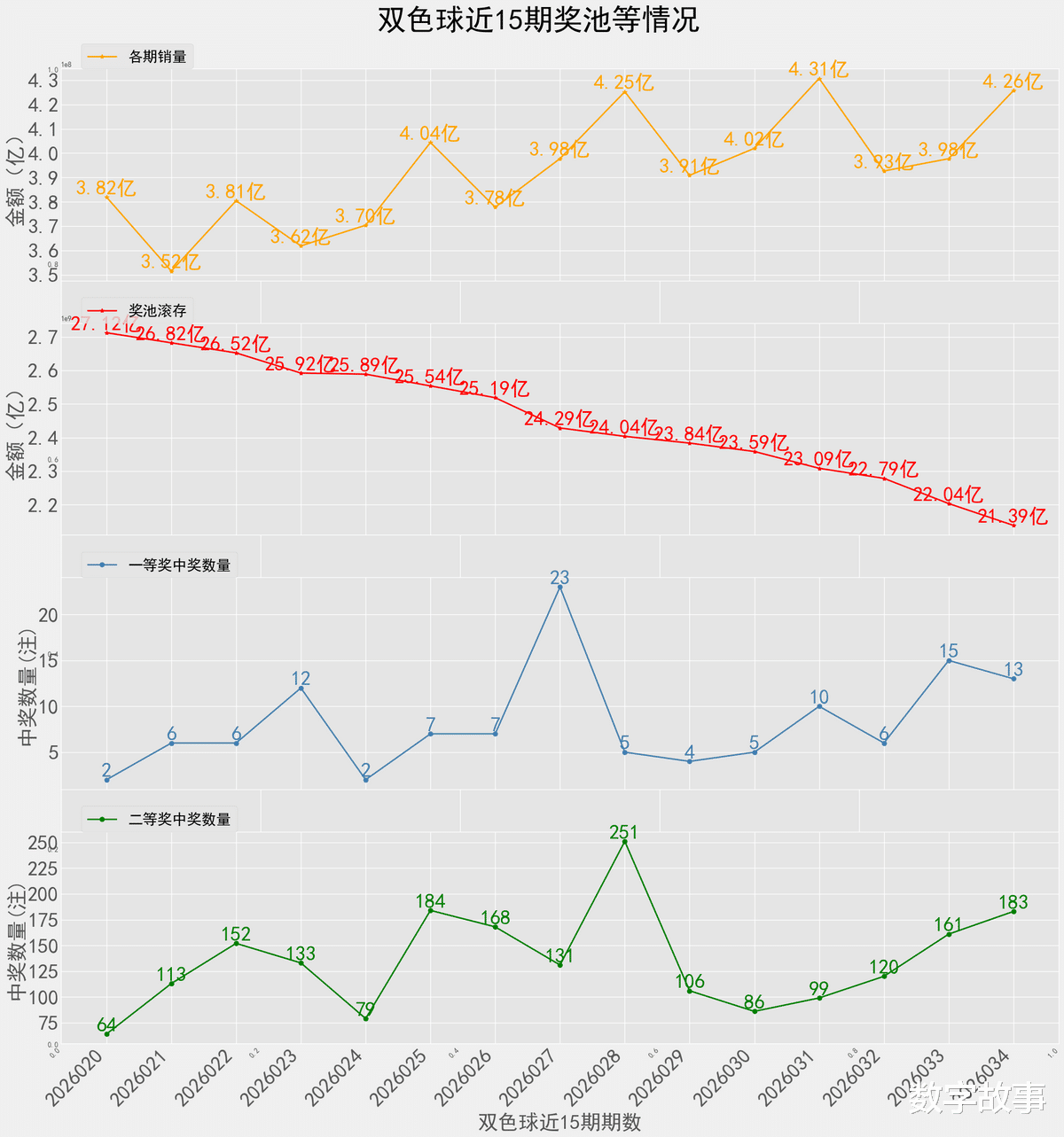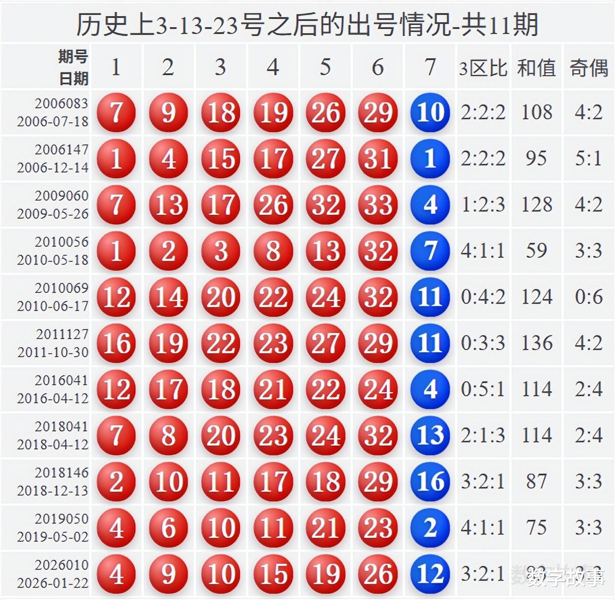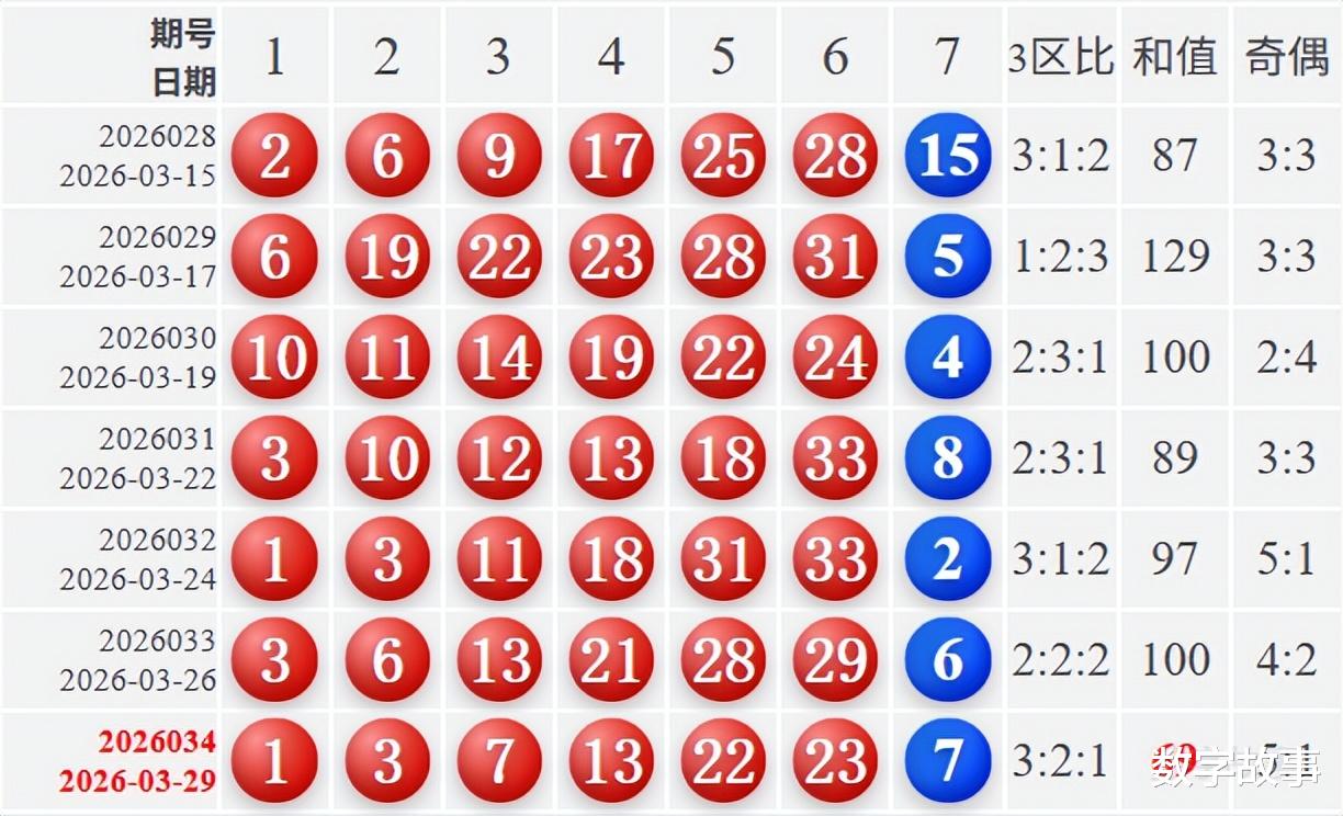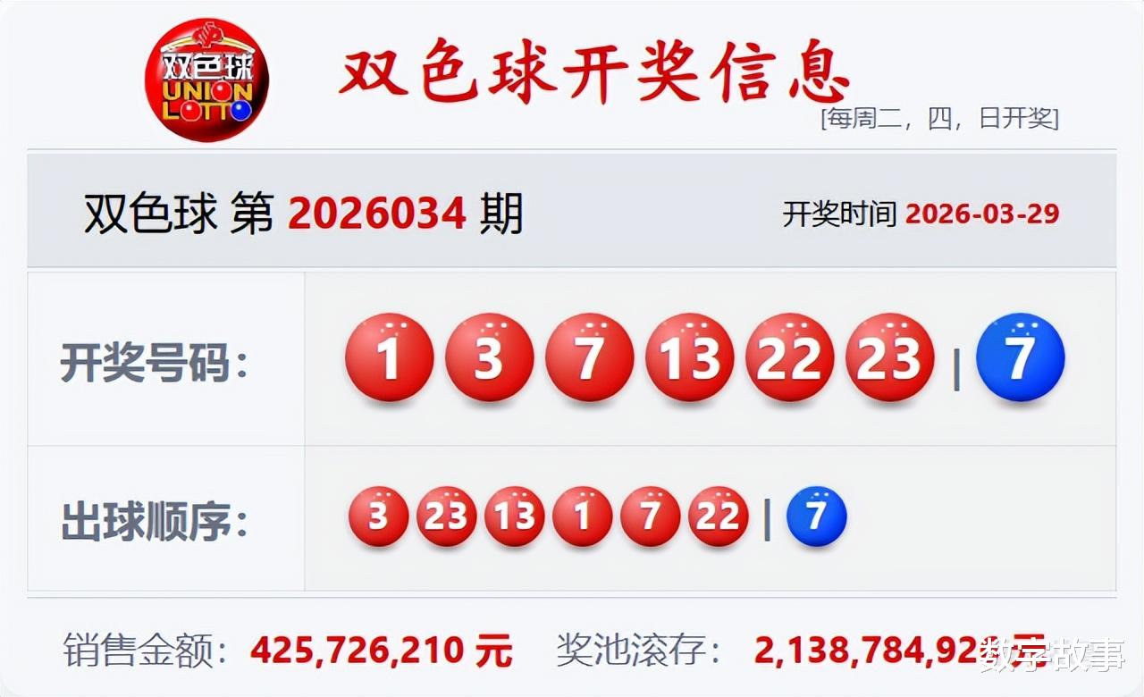 文末有双色球红球等差数3-13-23, 1-7-13, 同尾数3-13-23的历史统计。【福彩双色球26034期开奖结果及统计】红球号和值69,蓝球7,13注一等奖,奖池21.39亿(2138784926)。双色球26034期开奖结果及中奖情况:出奖时间: 2026-03-29 星期日 红球: 1-3-7-13-22-23蓝球: 7双色球红球重号叠码:3, 13红球隔期下落:1, 3红球奇偶比:5:1红球和值:69红球跨度:22 三区比:3:2:1连号: 22-23