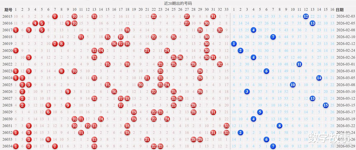 双色球2026034期红号在过去是否出现过?双色球2026034期红号: 1-3-7-13-22-23经查,历史上没有出现过与这一期6个红球或者5个红球号码一样的。与这一期4个红号一样的有24期,如下: