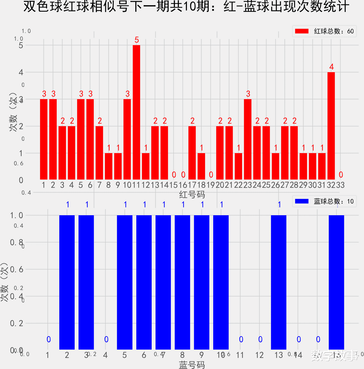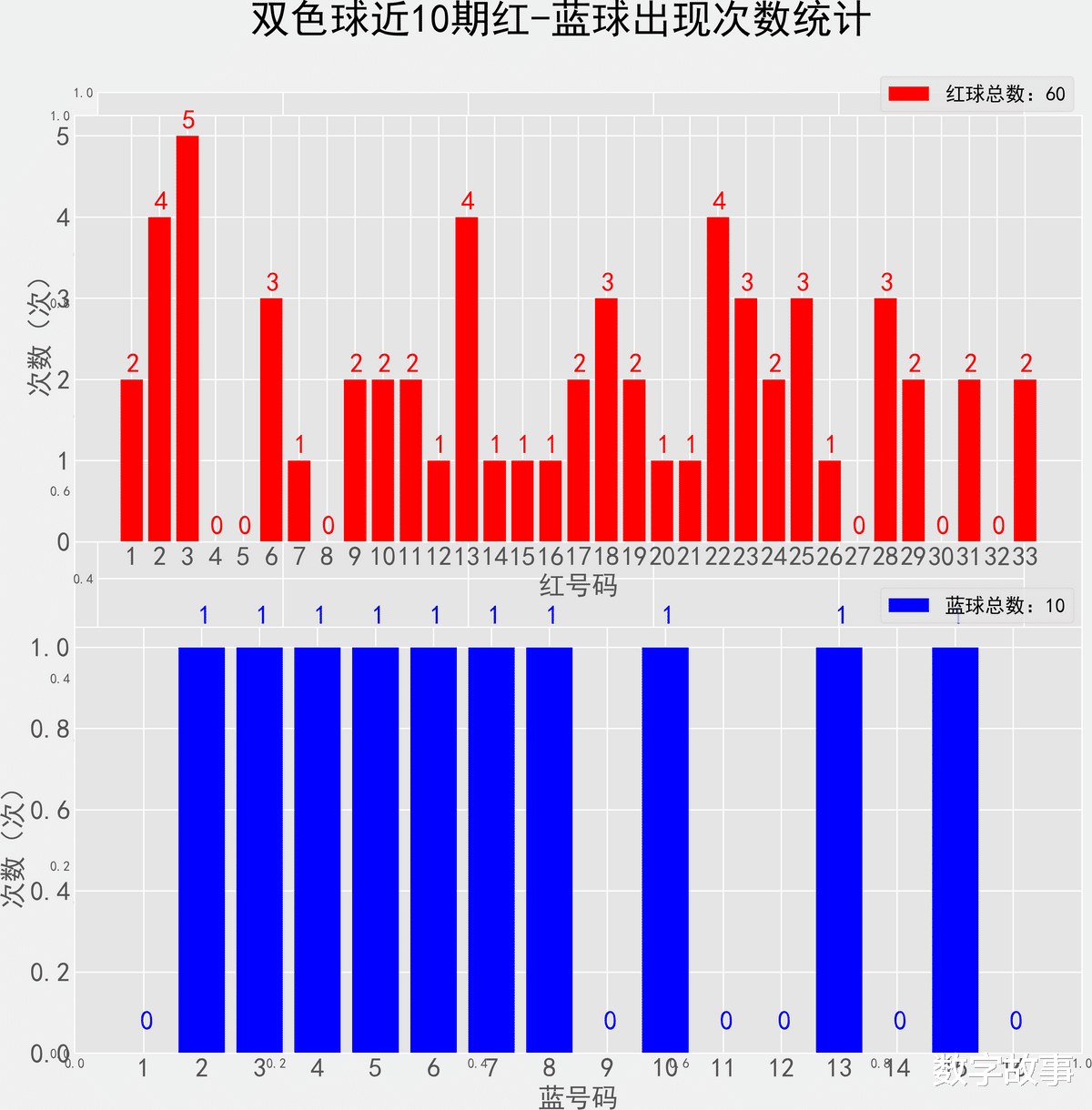 双色球近10期红蓝号统计情况统计样本数据: 60个红球 10个蓝球