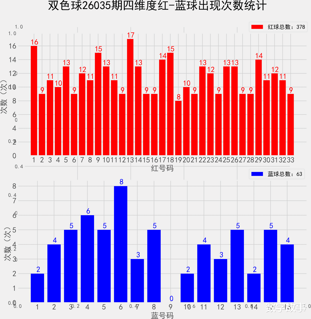 => 统计出现概率综合以上4个纬度的号码, 共63期根据出现的次数,分为热号,冷号,其他的为温号。统计样本数据:378个红球 63个蓝球