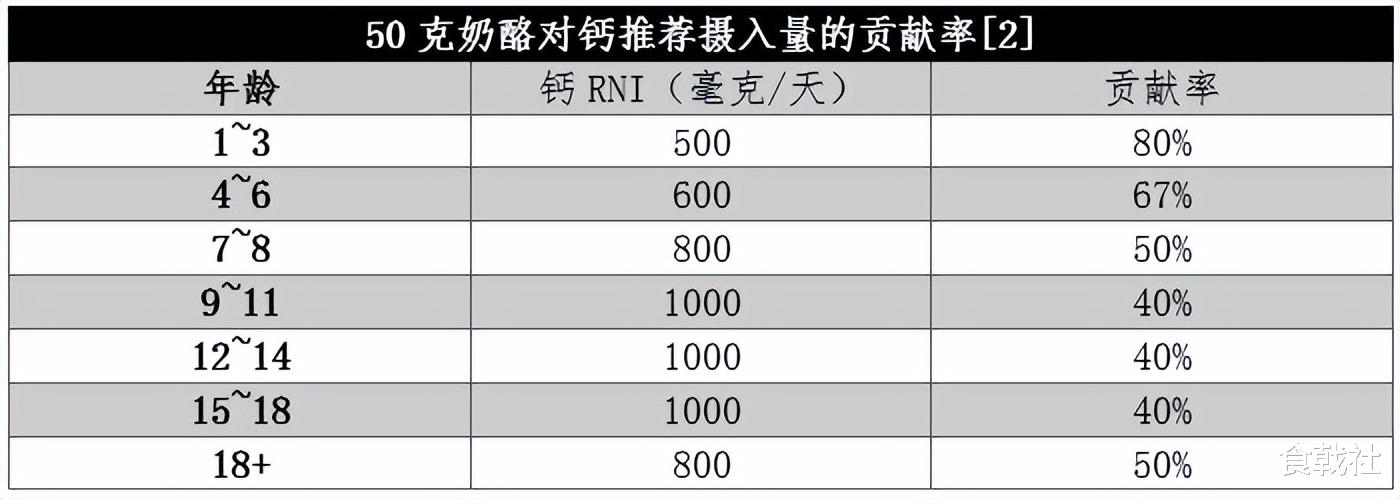 不同奶酪的钙含量有差异,根据《中国食物成分表 第 6 版》中的数据,奶酪的钙含量为 799mg/100g,是牛奶的近 8 倍。[1]《中国居民膳食指南》建议每天喝奶 300~500ml,按照同等量的蛋白质来换算,相当于 30~50g 奶酪,意味着如果吃 50g 奶酪就能摄入近 400mg 的钙,在满足一般人群每日钙需求量上具有很大贡献。