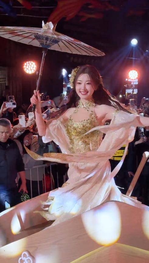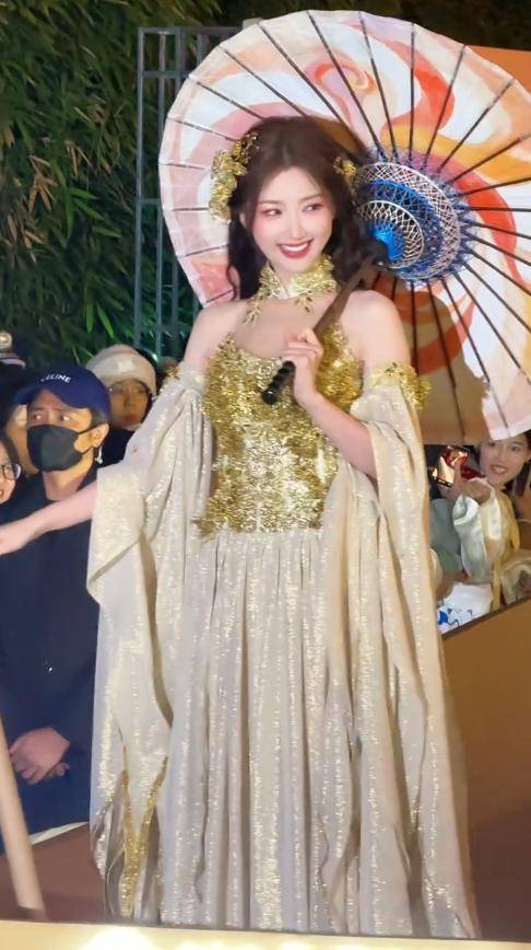 她以“非遗公主”的身份登场,穿着带有金色装饰的浅色非遗华服。