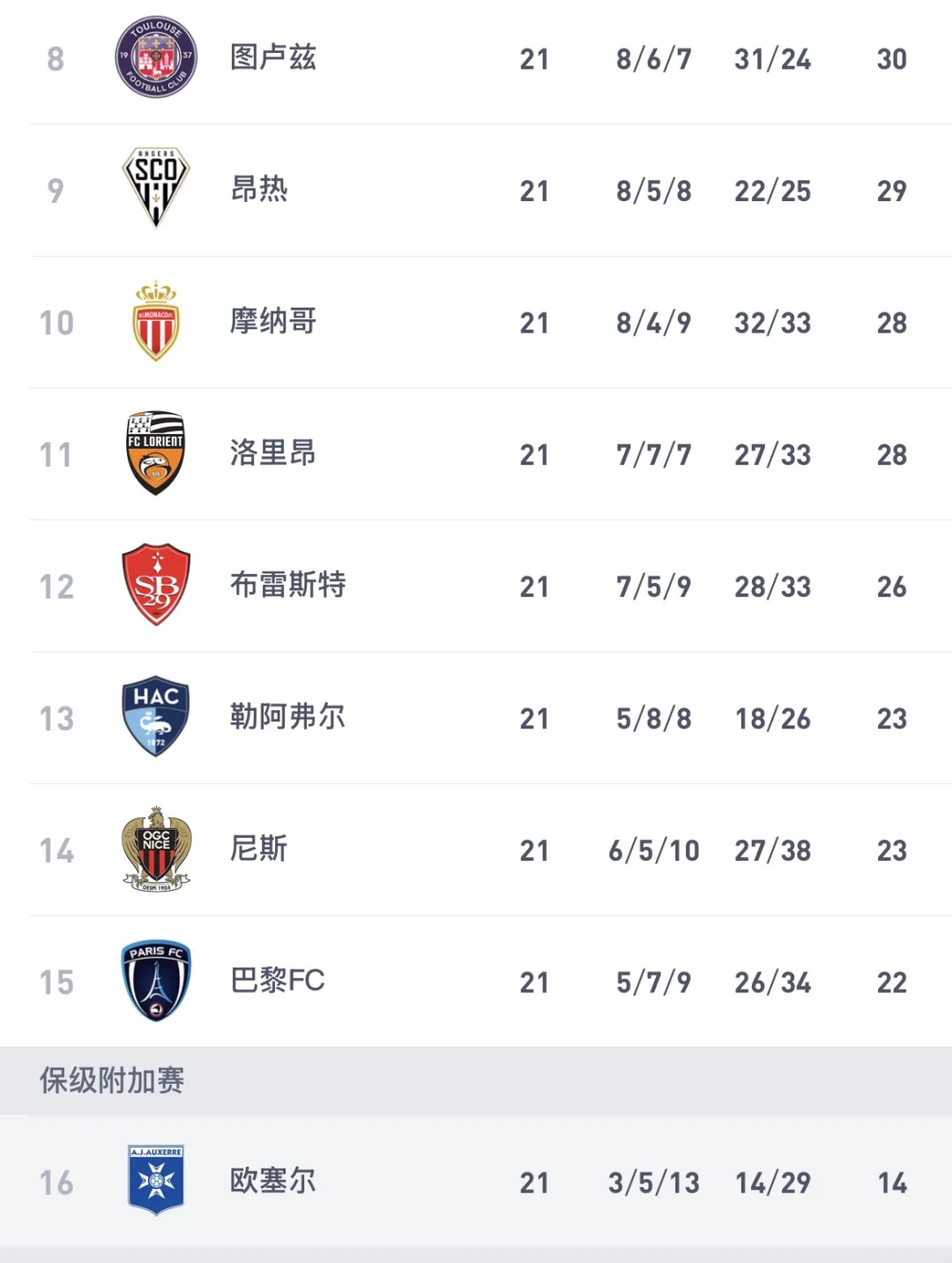 昂热 1-0 图卢兹这是一场价值6分的保级关键战。昂热(29分) 获胜后,积分榜排名和安全形势得到极大改善。而图卢兹(30分) 失利后,虽然暂时无降级危险,但被拖入了中下游混战。勒阿弗尔 2-1 斯特拉斯堡勒阿弗尔(23分) 主场拿下重要3分,这帮助他们进一步拉开了与降级区的距离。斯特拉斯堡(30分) 则继续徘徊在中游。南特 0-1 里昂南特(14分) 的失利让他们在保级泥潭中越陷越深,与安全区的分差继续扩大。综合赛果与积分榜,本赛季法甲呈现三大鲜明战团:争冠双雄会:巴黎圣日耳曼与朗斯(相差2分)形成了清晰的第一争冠集团。其余球队已被甩开至少7分,冠军很可能在这两队之间产生。