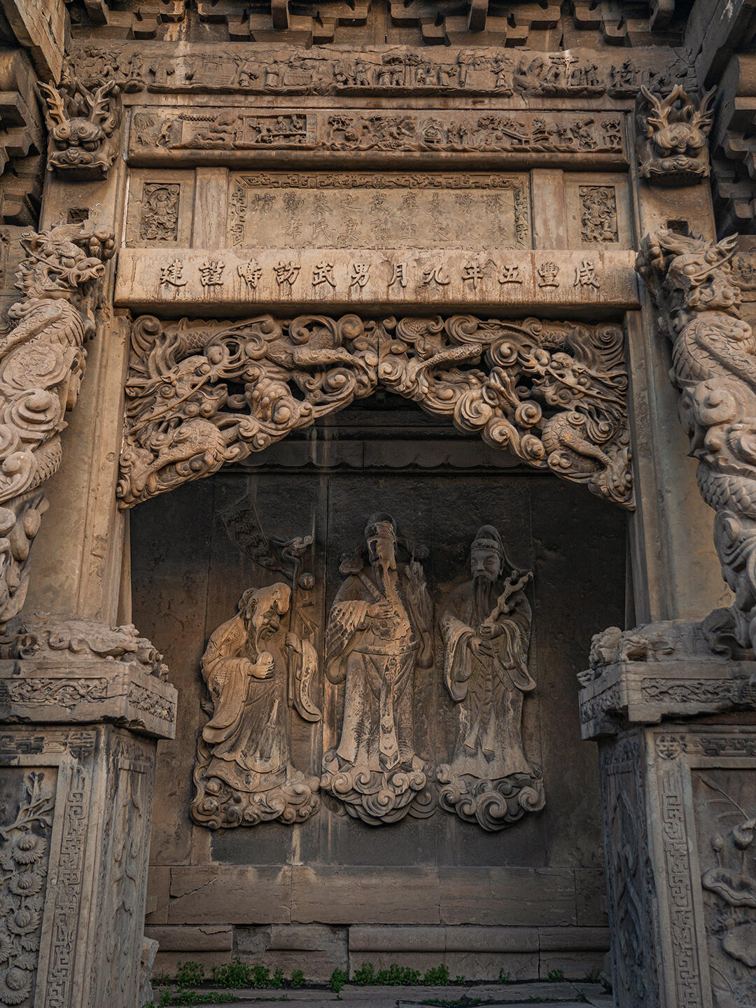 最富戏剧性的是2019年的国保评审现场。当专家们用三维扫描仪测绘牌楼时,意外发现雀替的龙纹中藏着"暗记":某片龙鳞上刻有"咸丰五年菊月吉旦"字样,某道云纹里嵌着"阳武村石匠李三娃造"的小字。这些工匠的"签名",让冰冷的石头有了温度,也为研究清代民间工匠制度提供了珍贵实证。