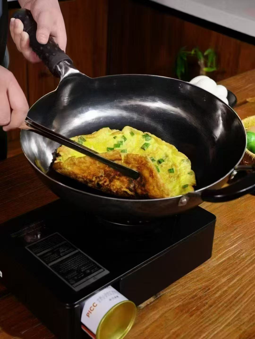第一次用它煎蛋,可能会有点粘——别慌,这是铁锅在“认主人”。按照说明书开锅后,每次炒菜的油脂会慢慢渗进锤印的纹路里,形成一层天然的“保护膜”。三个月后你会发现,煎鱼时不用颠锅,鱼皮也能完整脱落;炒番茄鸡蛋时,铲子轻轻一推就滑到底。