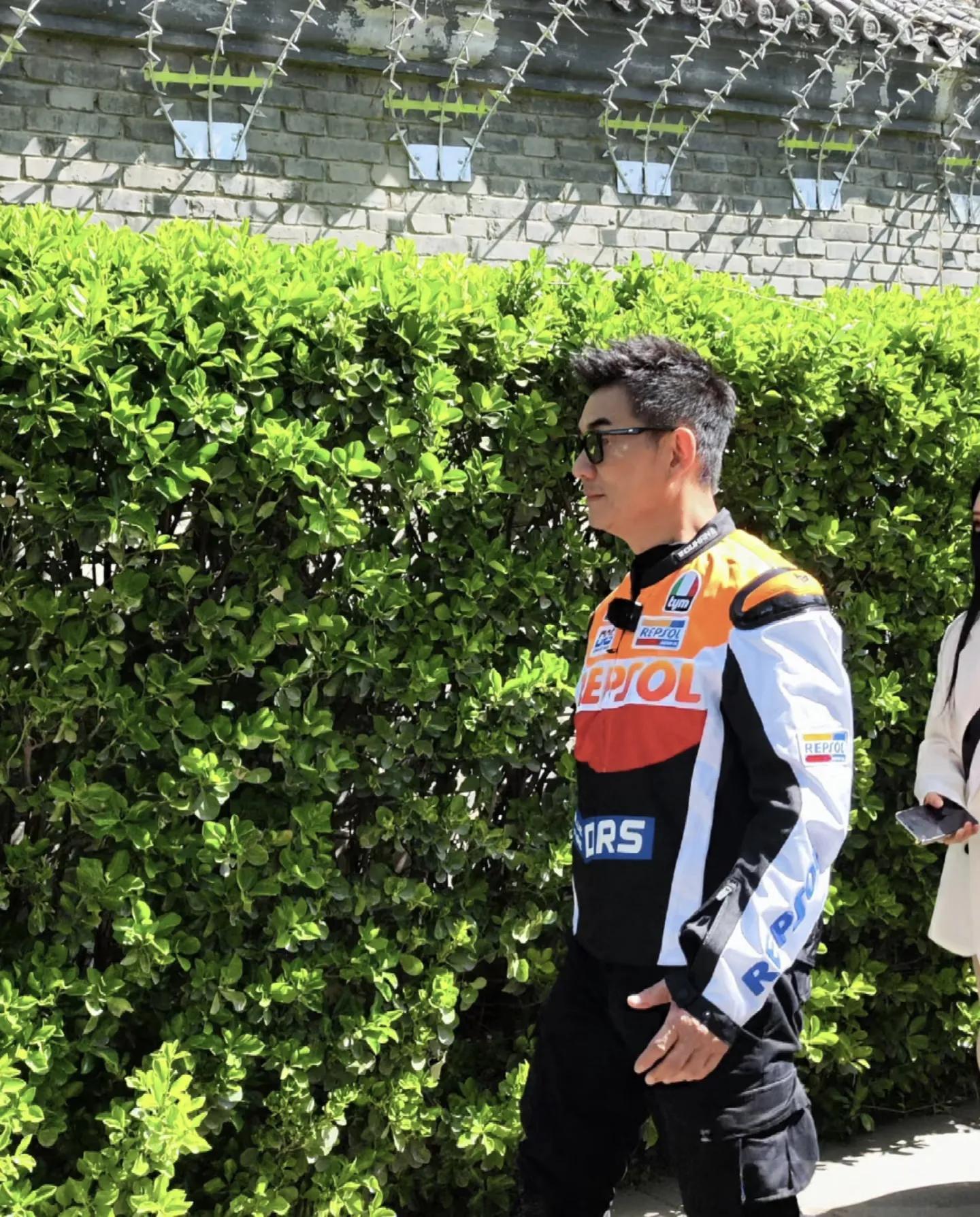 当天任贤齐穿了一身骑手服,戴着大墨镜,这身打扮非常酷,走在大街上很拉风,非常显眼!