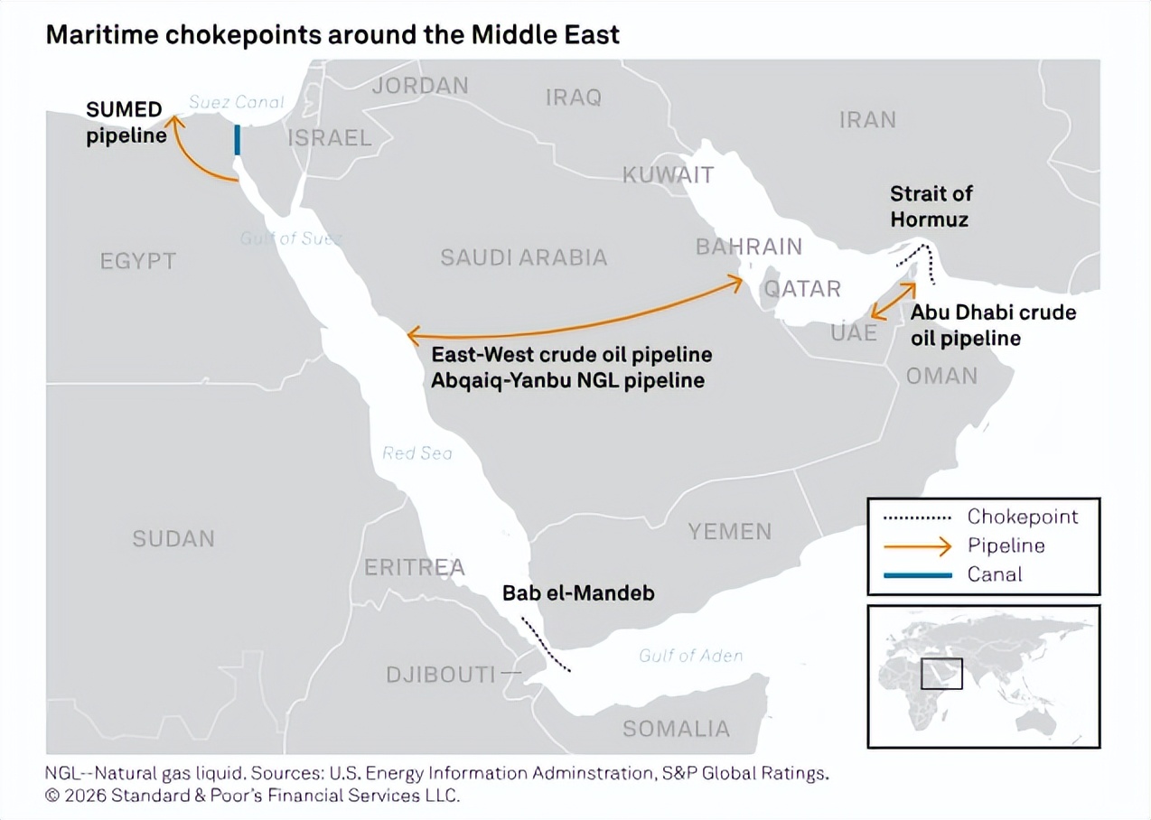 据标普全球估算,沙特阿拉伯超过80%的原油出口经由霍尔木兹海峡运输,而阿联酋的这一比例约为65%-68%。标普全球了解到,阿联酋和沙特阿拉伯拥有其他原油运输方案:沙特阿拉伯通过位于延布红海港的东-西原油管道运输,而阿联酋则通过位于富查伊拉的阿曼湾管道运输。