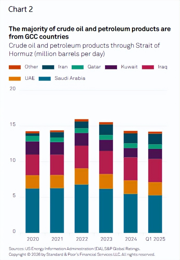 标普全球分析了长期中断对途经该海峡的碳氢化合物价值链实体可能产生的影响,并指出沙特阿拉伯和卡塔尔的运营商可能比阿联酋的运营商面临更大的风险。从海湾合作委员会(GCC)国家经霍尔木兹海峡出口液化天然气和石油的公司将受到最严重的冲击。