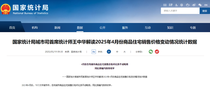 5月19日,国家统计局城市司首席统计师王中华解读2025年4月份商品住宅销售价格变动情况统计数据。2025年4月份,70个大中城市中,各线城市商品住宅销售价格环比持平或略降,同比降幅均持续收窄。
