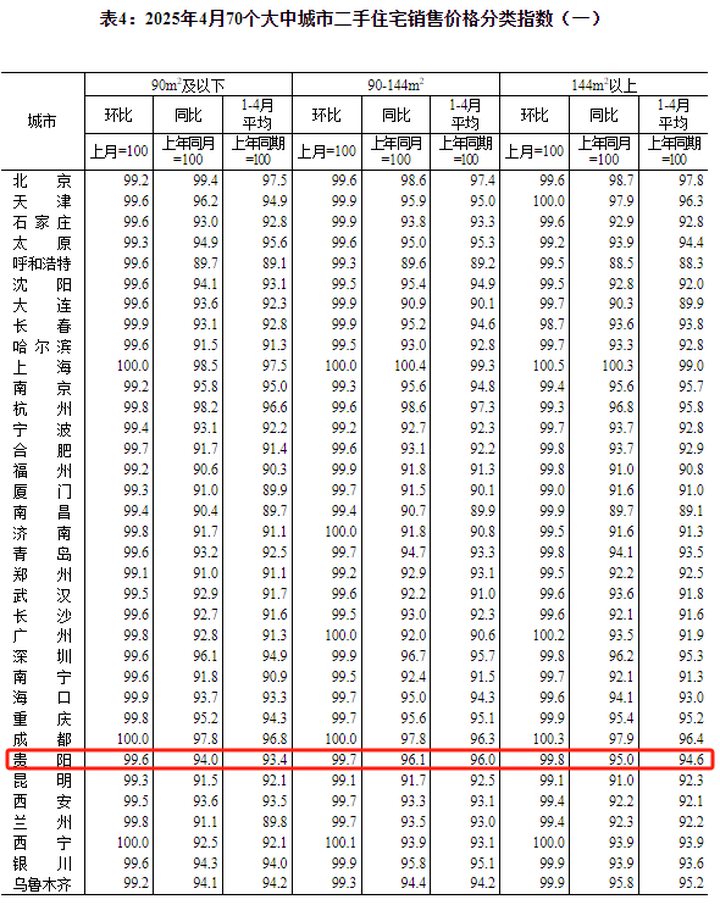表4:2025年4月70个大中城市二手住宅销售价格分类指数
