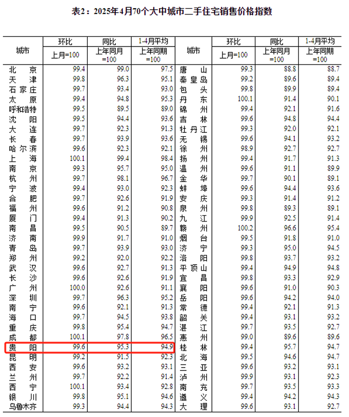2025年4月份贵阳市新建商品住宅销售价格环比下跌0.3%,二手住宅销售价格环比下跌0.4%。
