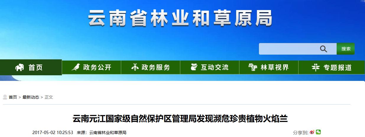 信息来源:云南省林业和草原局 云南元江国家级自然保护区管理局发现濒危珍贵植物火焰兰 2017-05-02