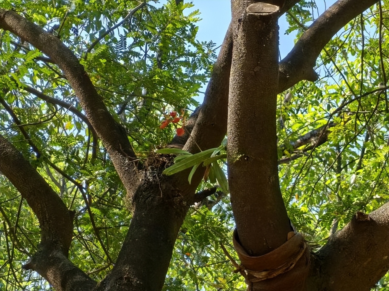 听到声音的众人,都顺着他指的方向看过去,只见一棵长得十分高大的树上,长着1株植物。