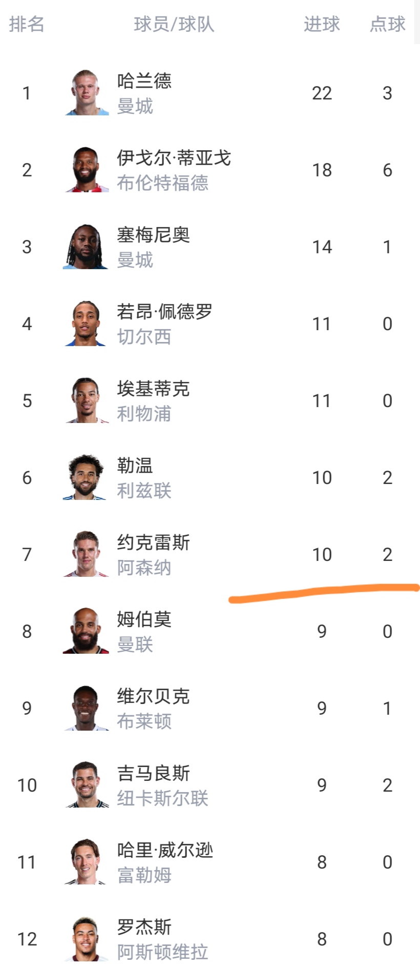 射手榜包括佩德罗、哈兰德在内7人进球上双。