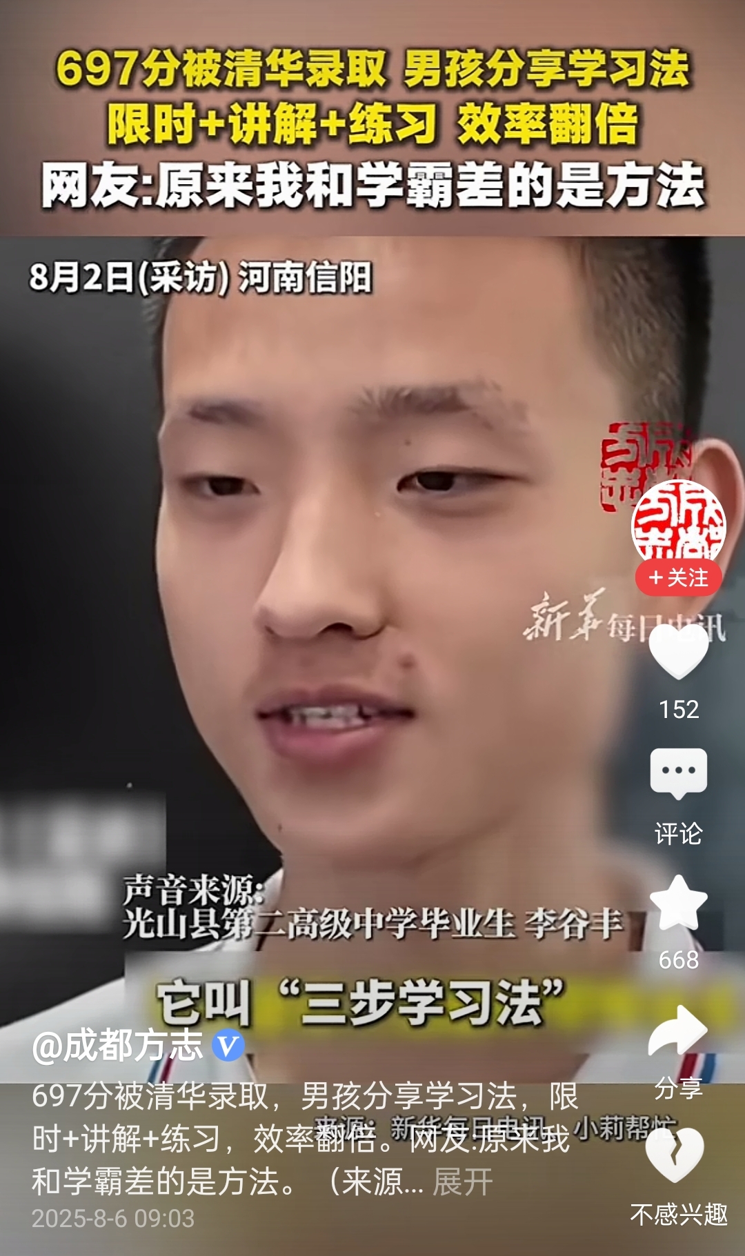 河南一学生高考697分,被清华大学录取,面对镜头,他非常大方地分享了自己的方法。他把自己的方法称为“三步学习法”。