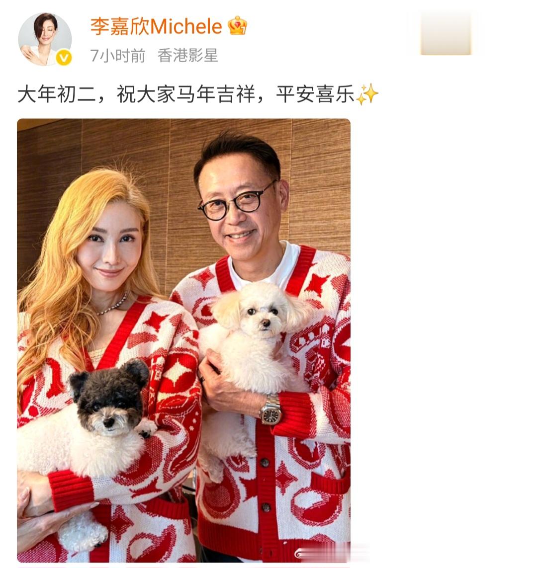 大美女李嘉欣大年初二晒出与老公的合影,并配文祝大“家马年吉祥,平安喜乐!”55岁的李嘉欣和63岁的许晋亨,穿着大红色的情侣装,15岁的独生子许建彤并没有露面,两人分别抱着一只宠物狗,一脸笑容喜气洋洋。