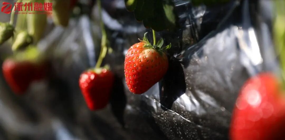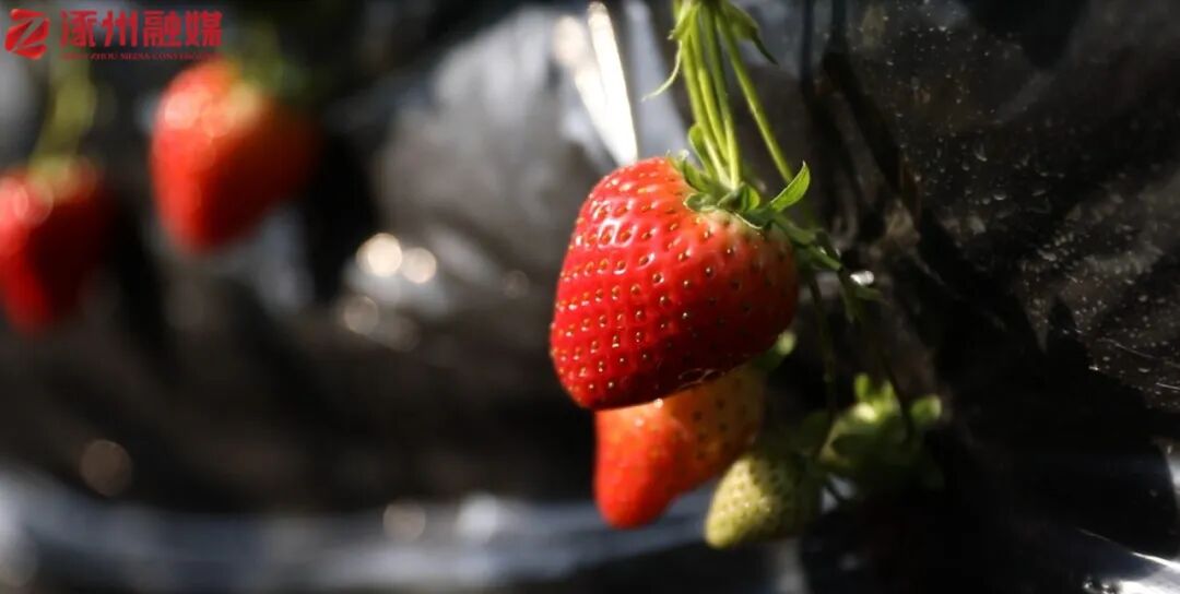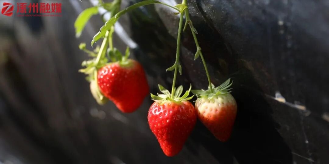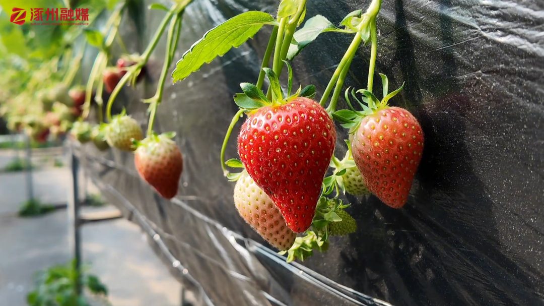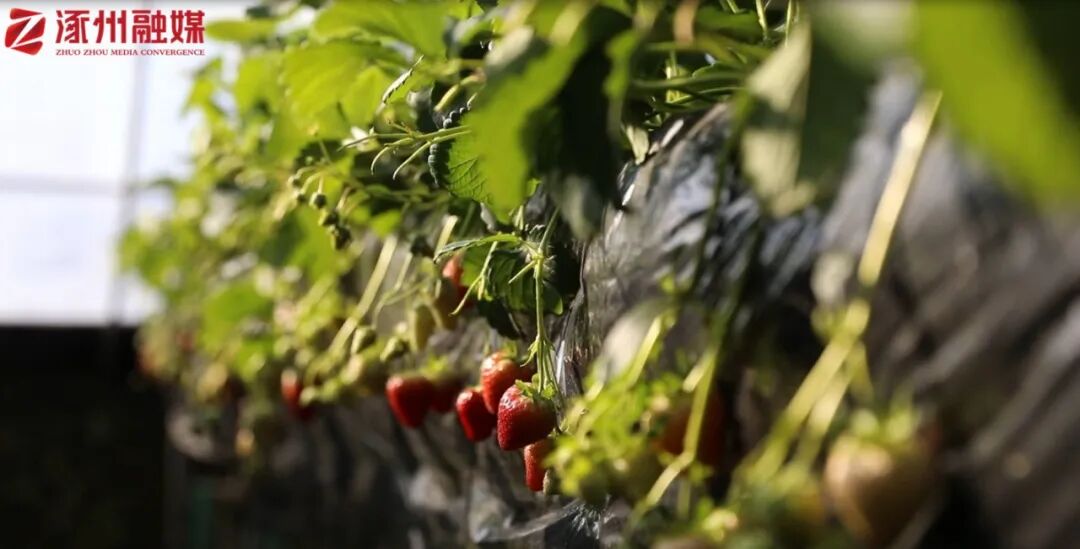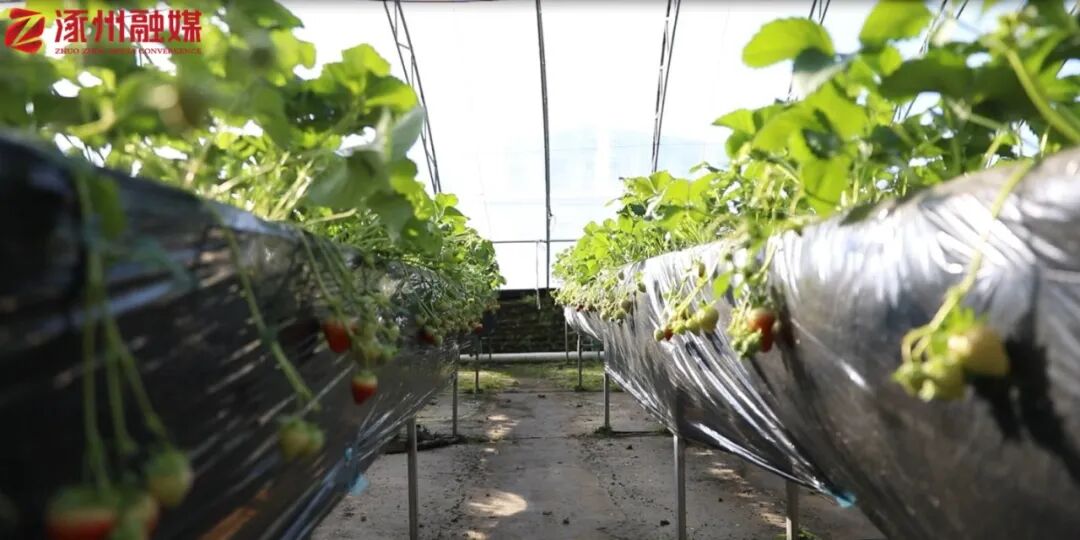 在高架种植草莓大棚,一垄垄翠叶间缀满红果,清甜的果香沁人心脾。