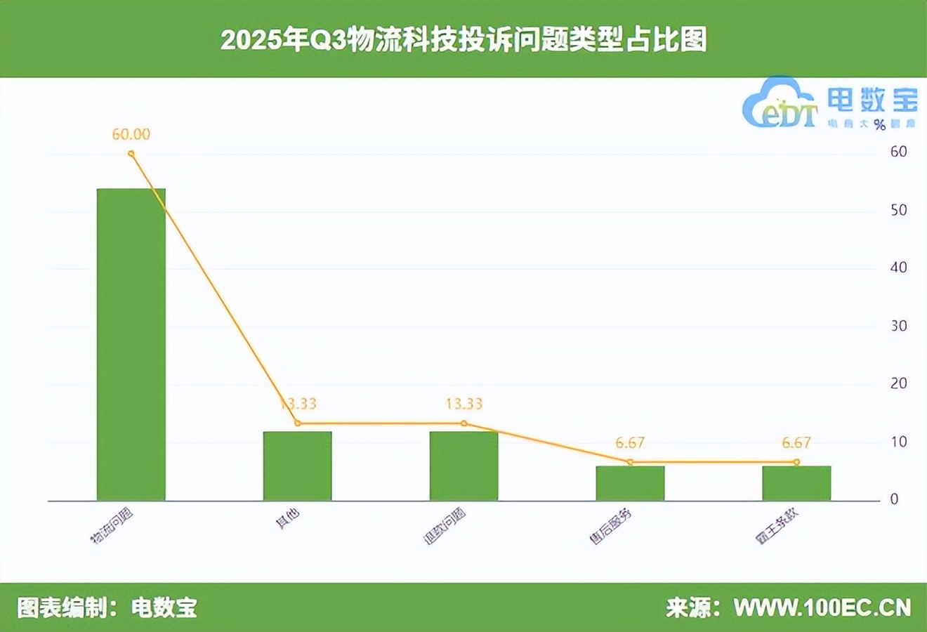 据“电诉宝”显示,2025年Q3全国物流科技用户投诉问题类型主要包括物流问题(60%)、退款问题(13.33%)、售后服务(6.67%)、霸王条款(6.67%)。